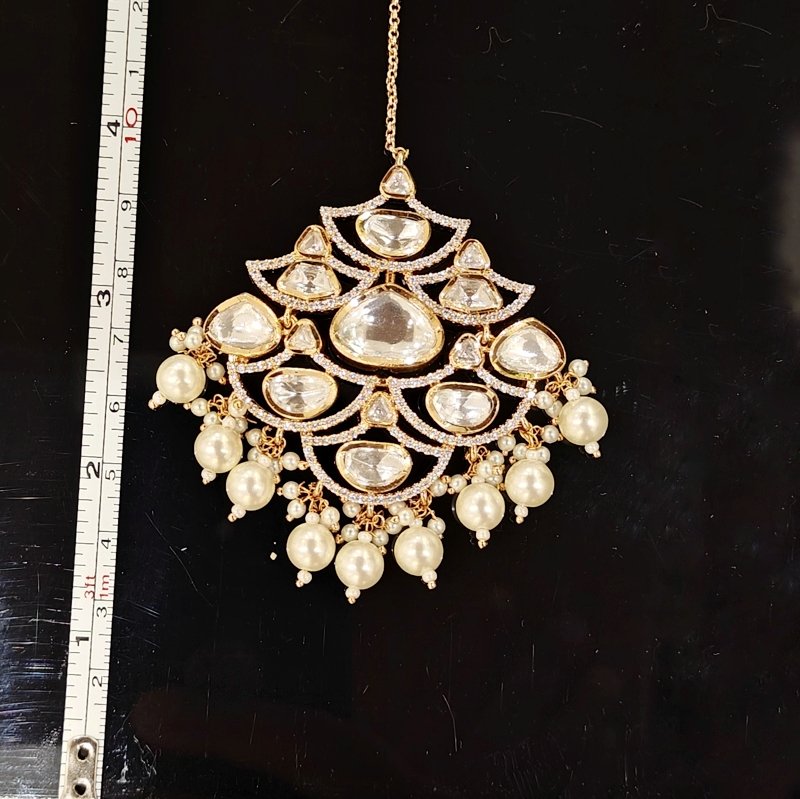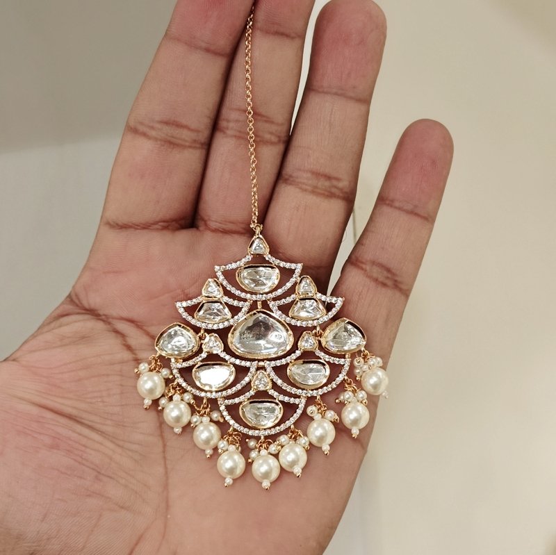 Very beautiful maangtikka made in diya pattern pattern crafted with uncut polki and beaded with pearls