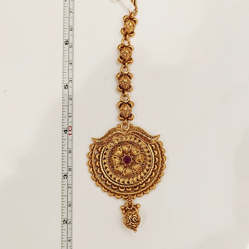 Big sized maangtikka made in ball and die workmanship ,finished in antique gold colour.