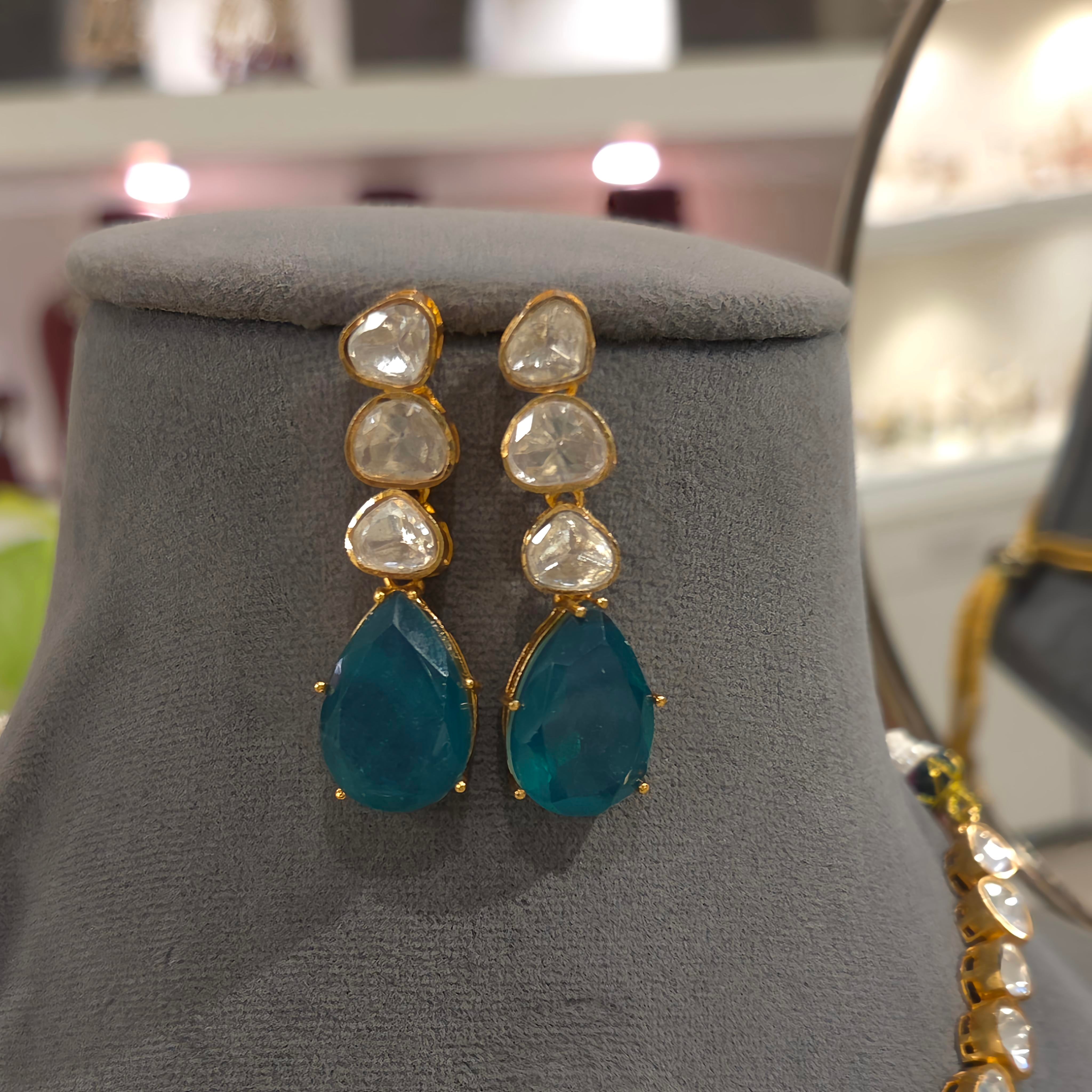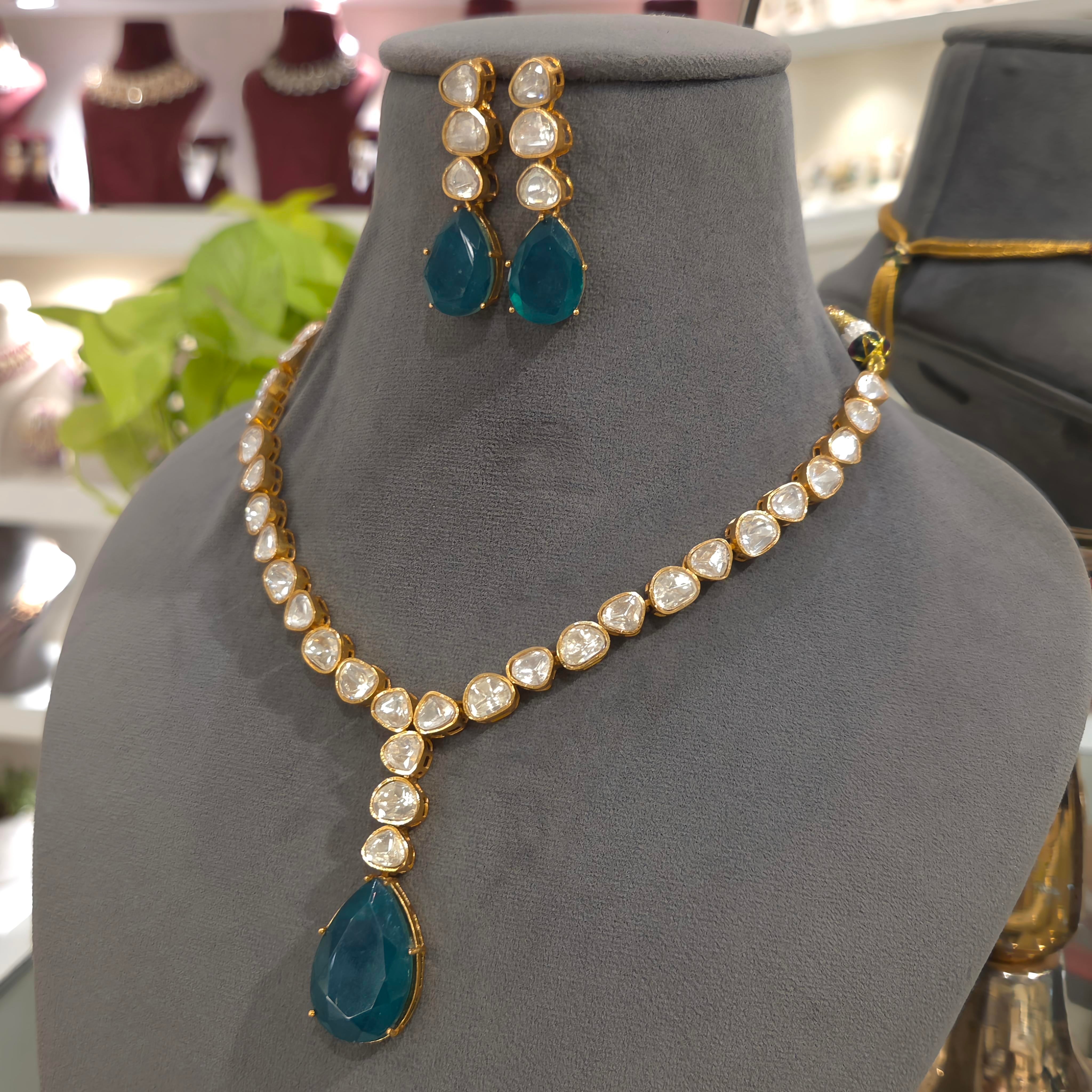 Introducing the gorgeous Asvi moissanite set, featuring a single line pendant plated in rich 22 kt gold colour and and adorned with sparkly moissanite polki and doublet green and ruby coloured stones . These earrings also come with screw back, providing a secure and comfortable fit. Elevate your jewelry collection with this elegant and timeless set.