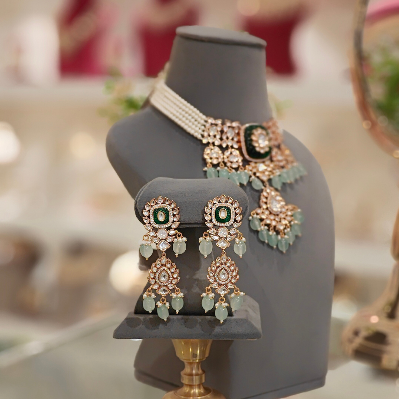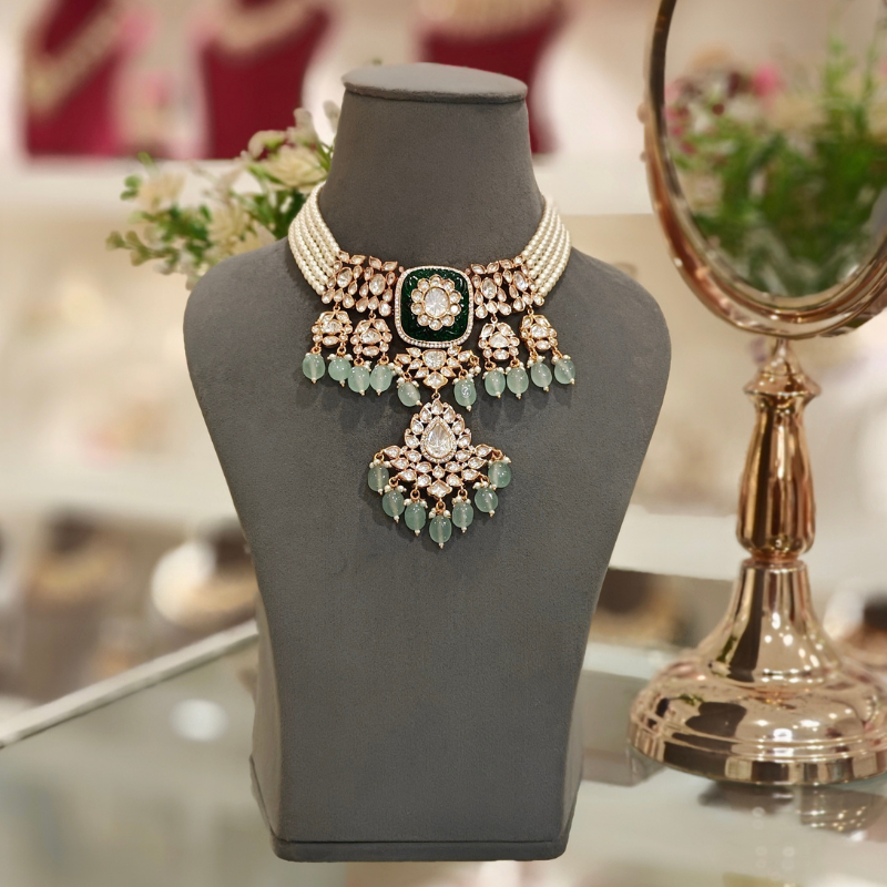 The pink polki statement choker set boasts a centered bottle gree stone engraved with Hand and polki stone, beaded with a mint green monalisa stones . The back of the choker is tied with micro pearl strings.