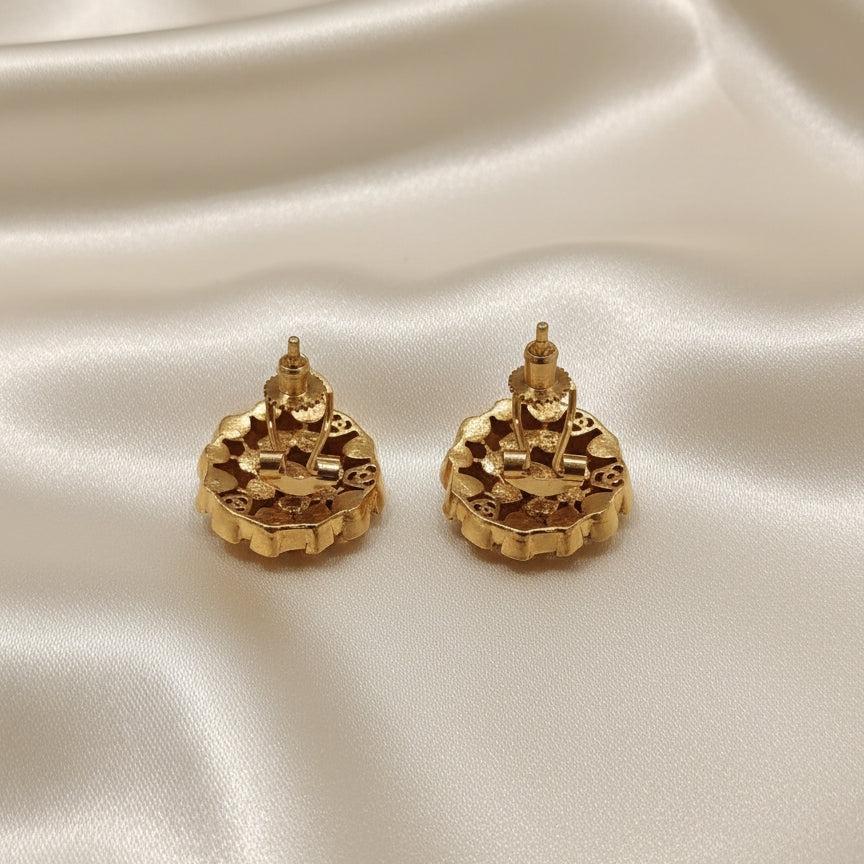 Beautiful round shaped studs made with moissanite polki gems and plated in 22 kt gold .