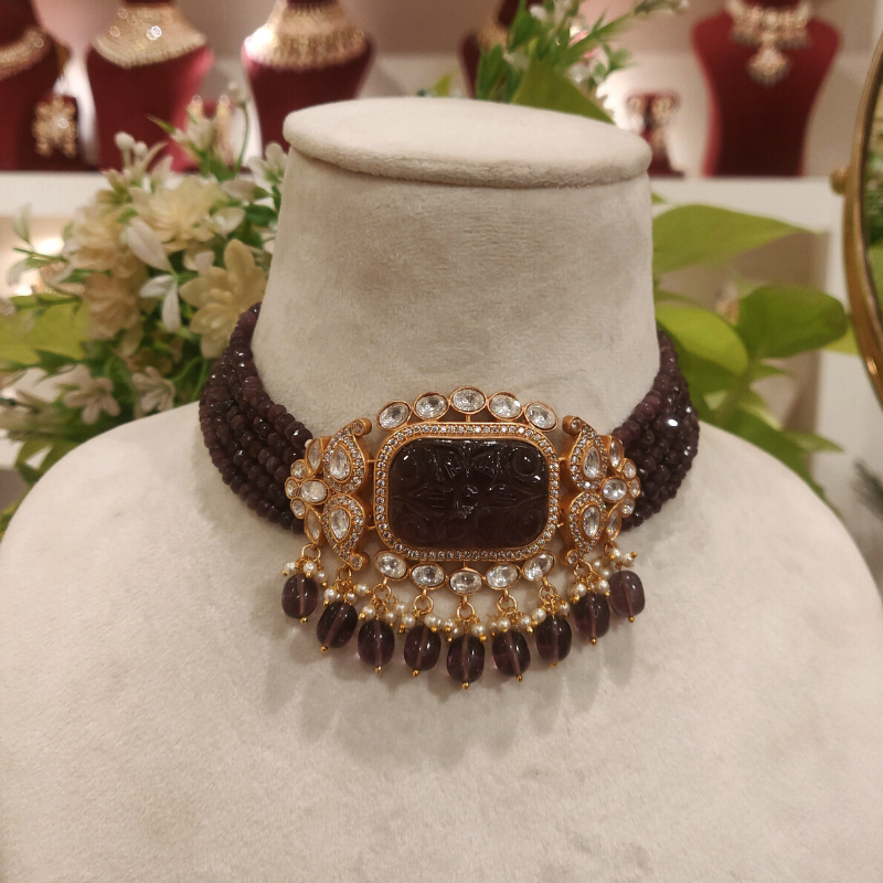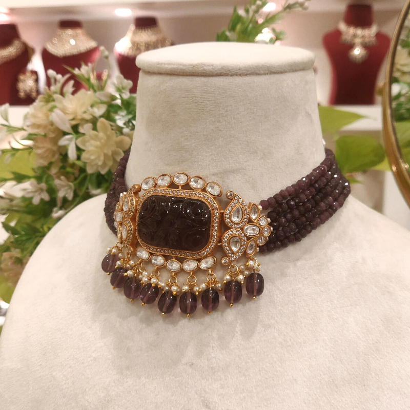 This stunning choker necklace set showcases polki stones and is plated with 22 karat gold color. A vivid purple-colored engraved stone is featured at its center, while the set is beaded with oval Sea beads and purple hydro beads string at the back.