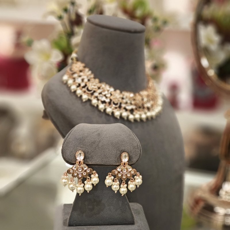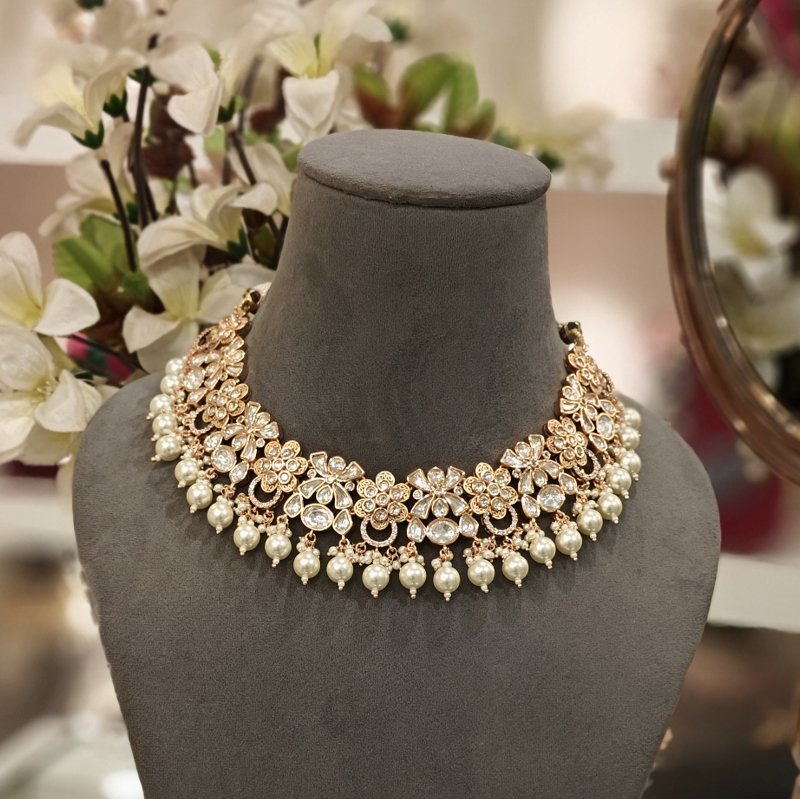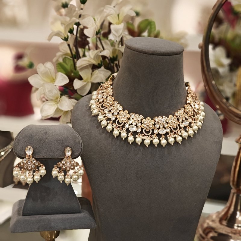 This antique enameled necklace set is made in uncut kundan polki with pearls at the bottom . This set is plated in 18 kt gold plating to give it real and royal look .