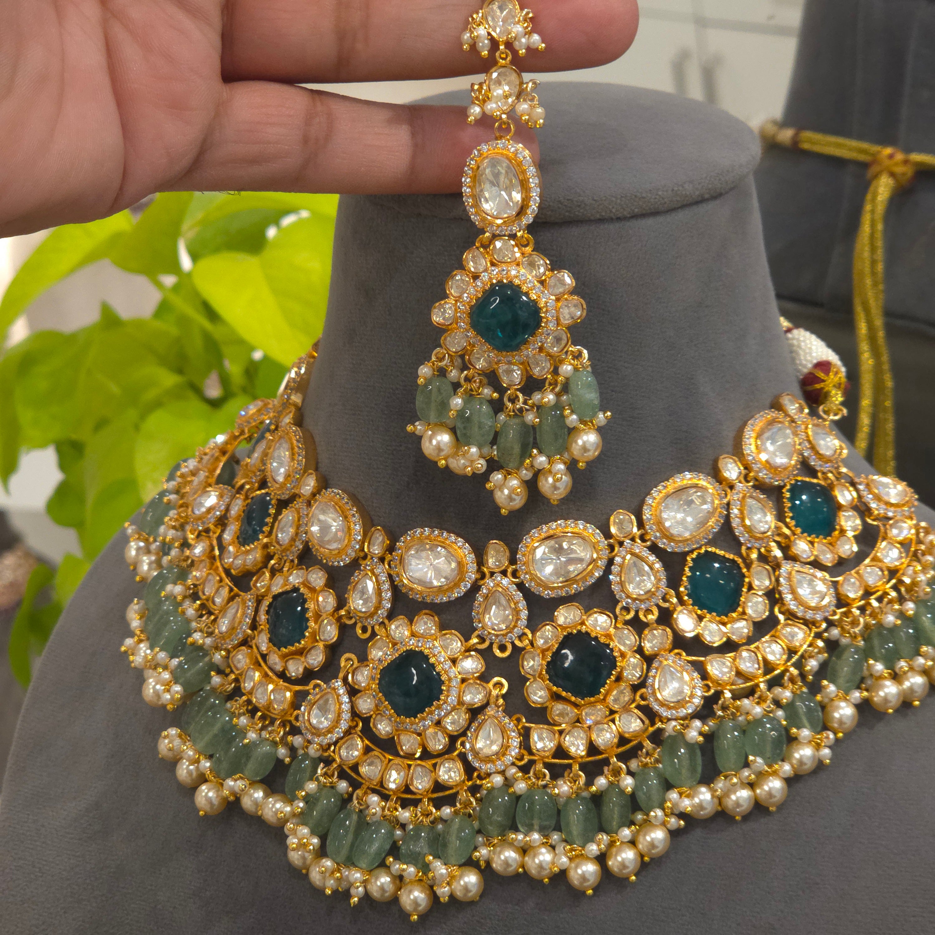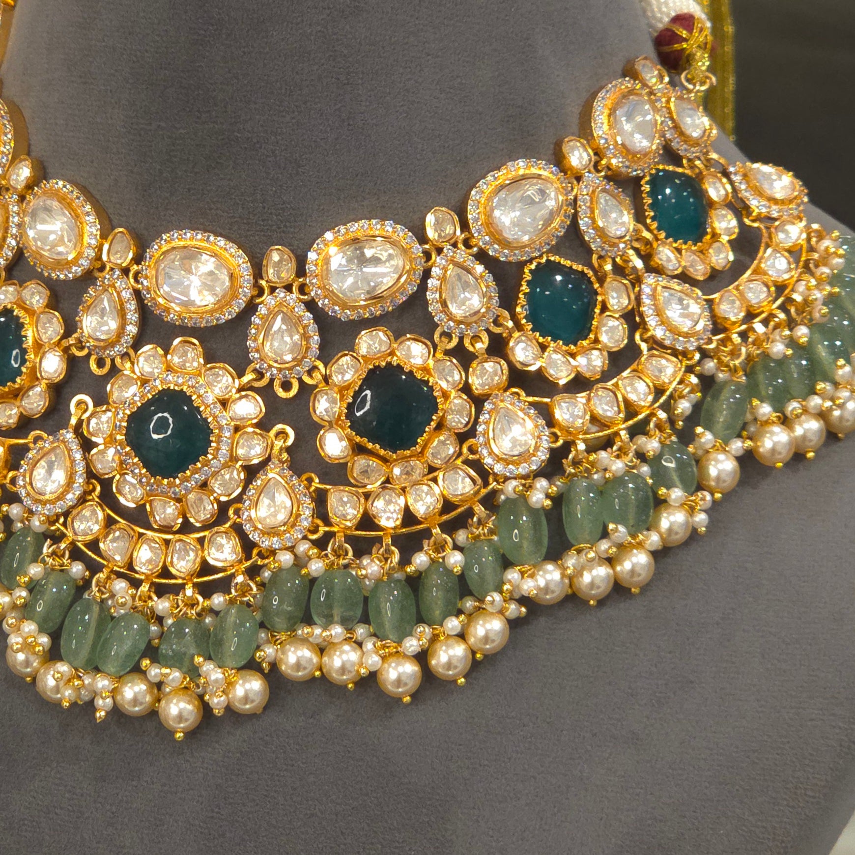 This Ayesha moissanite polki set is the epitome of elegance and sophistication. Crafted with mixed metal alloy and plated in 22 kt gold, this bridal and semi-bridal necklace set showcases lustrous top shade moissanite polki with emerald green doublets. Adorned with micro pearls and emerald green strawberry beads, it exudes luxury and charm for any special occasion. .