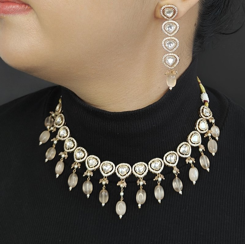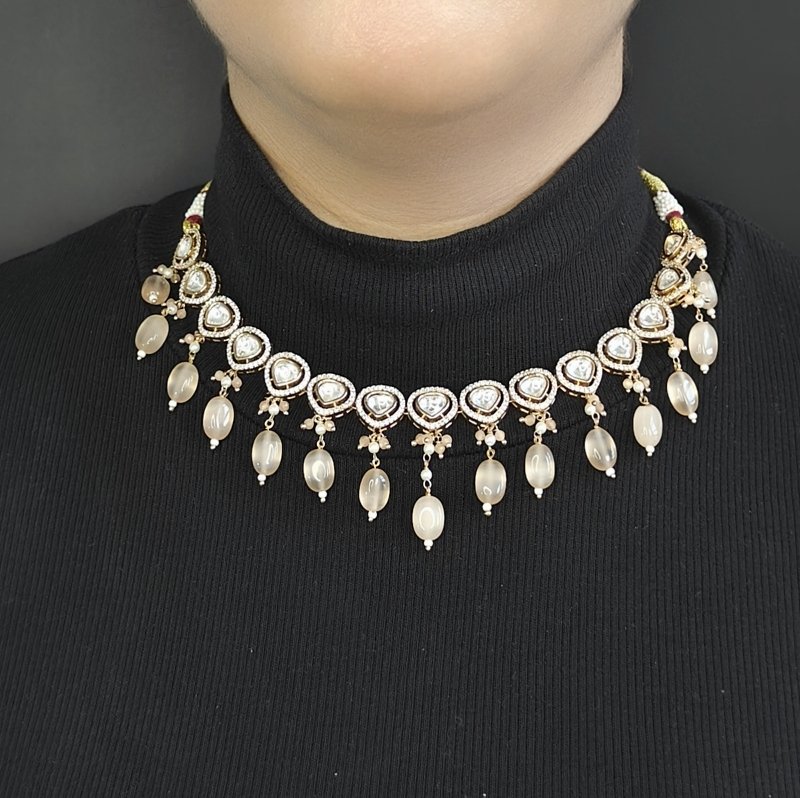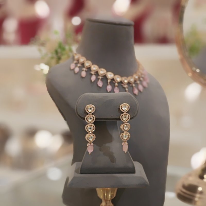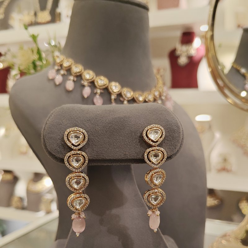 The Azeen necklace set is made with uncut artificial open polki surrounded with cz stones ,beaded with pink monalisa two tone beads .