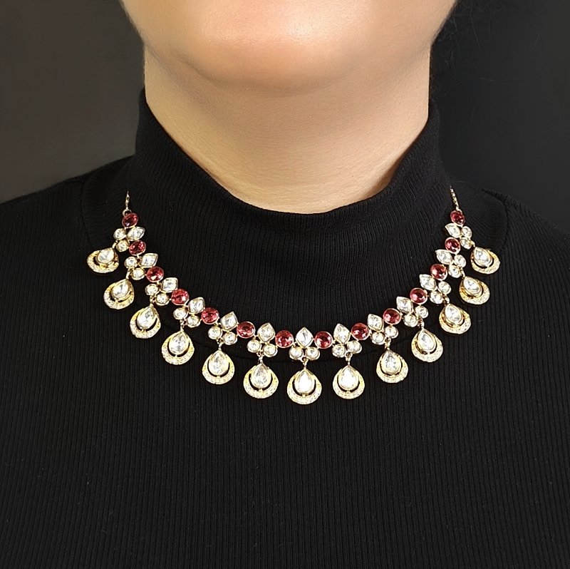 This necklace set, adorned with clear and red artificial polki, has been coated with 22 kt gold polish. It comes with matching earrings.