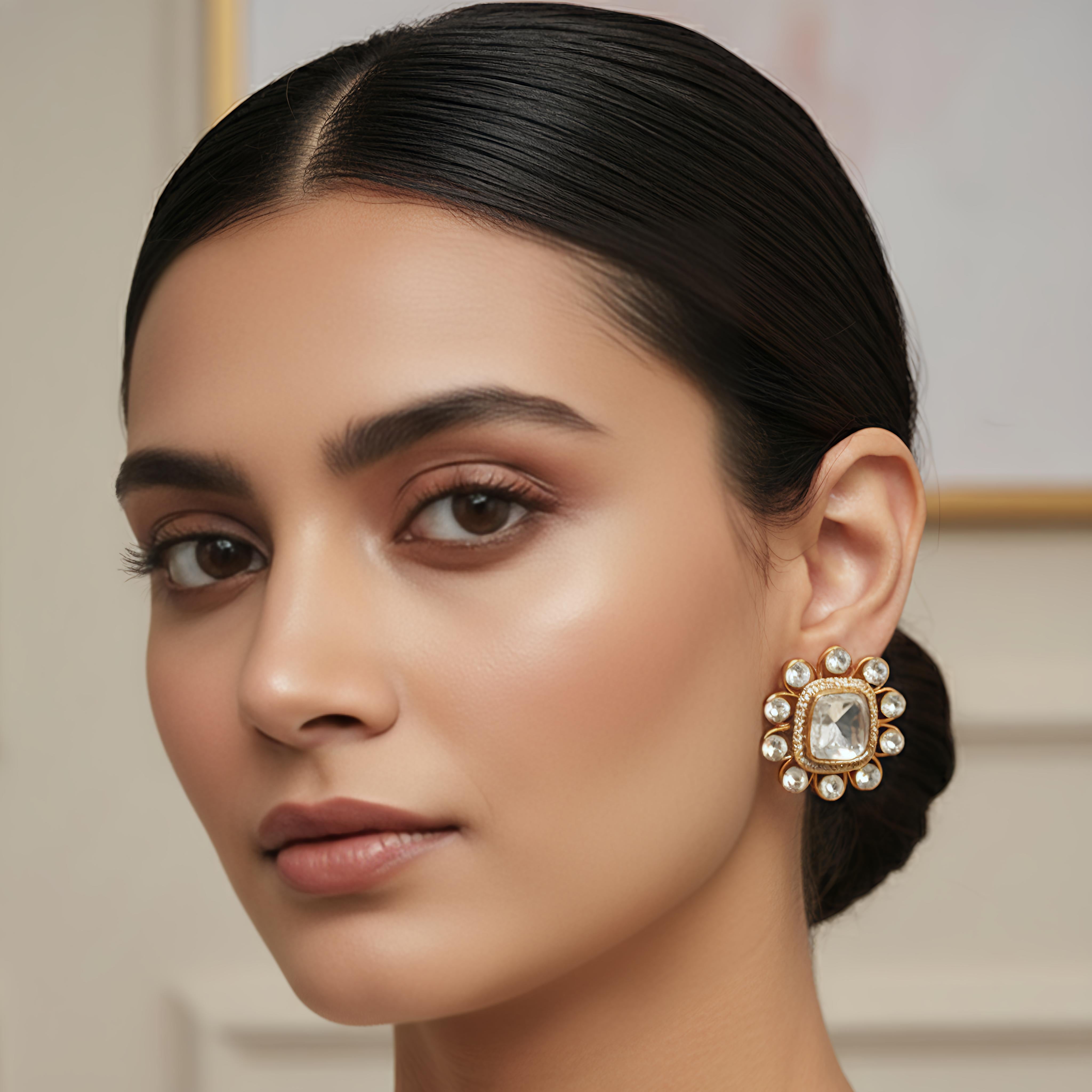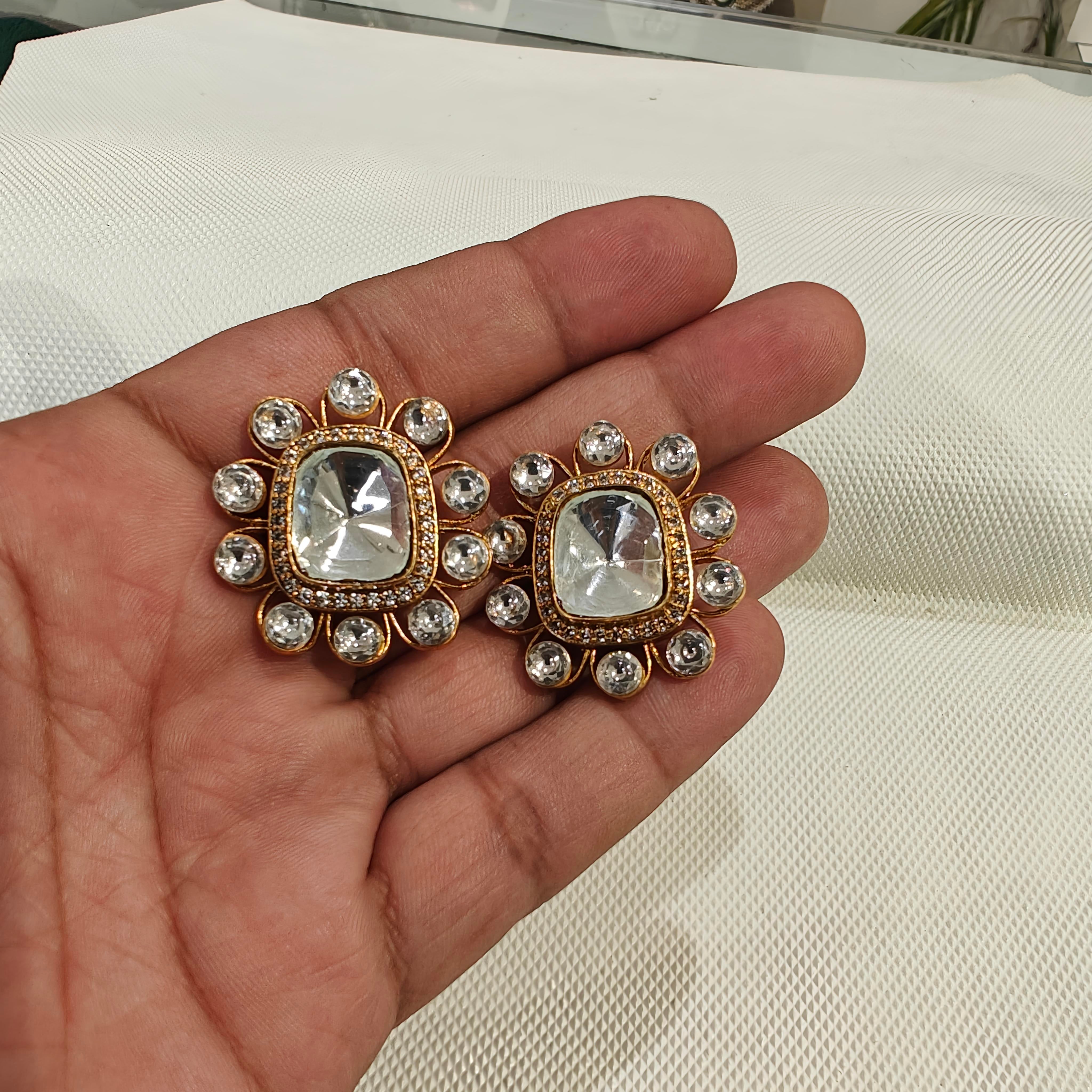 Beautiful big sized moissanite studs with cz stones ,plated in 22 kt matt gold colour and have a bombay clasp at the back