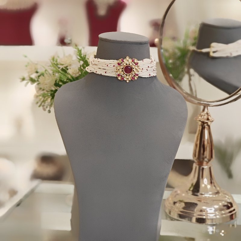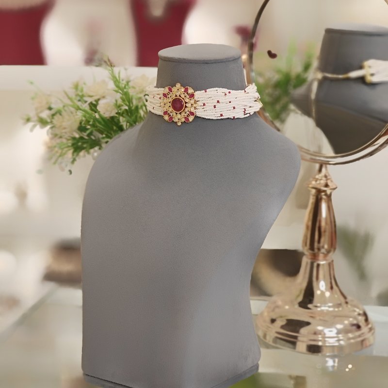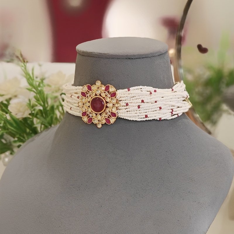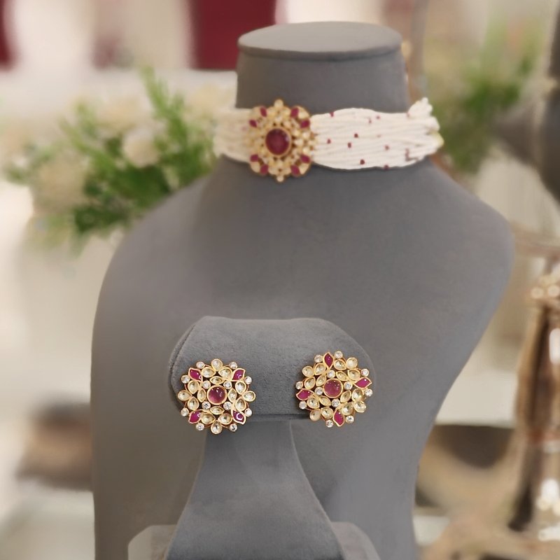 A beautifully crafted choker set adorned with pearl beads, featuring a soft and subtle array of majenta color, coupled with a pair of stylish studs.