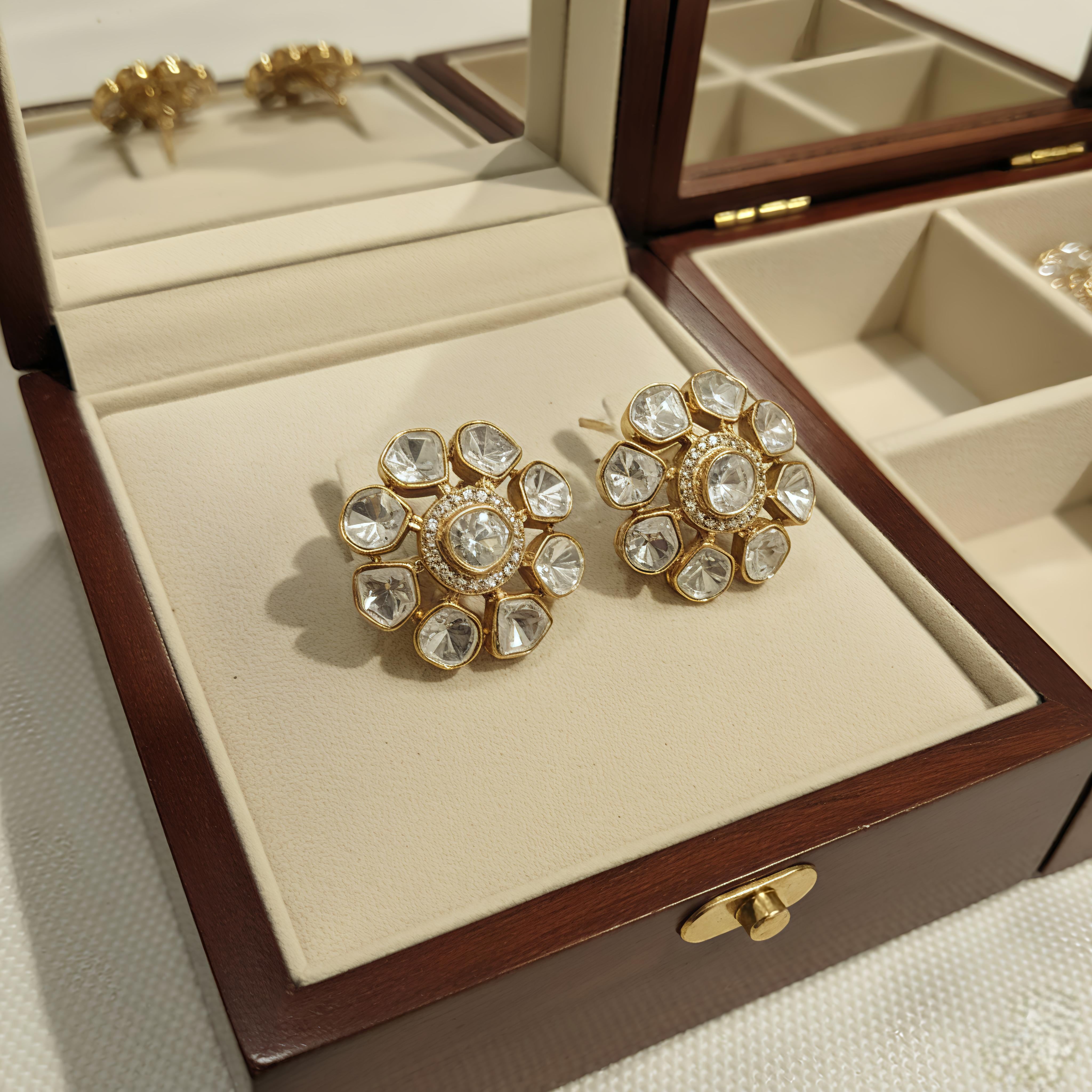 These beautiful studs are made in mixed metal alloy and plated in 22 kt gold studded with moissanite and cz gems. These are big sized statement earrings with bombay clasp at the back .