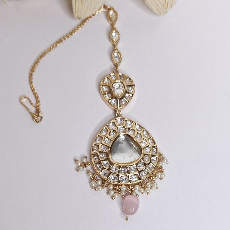 Crafted with the finest 18-karat gold plating, this maangtikka is adorned with stunning uncut artificial polki and monalisa Pink drop beads . Revel in the beautiful craftsmanship of this piece, which is sure to make you feel like royalty.