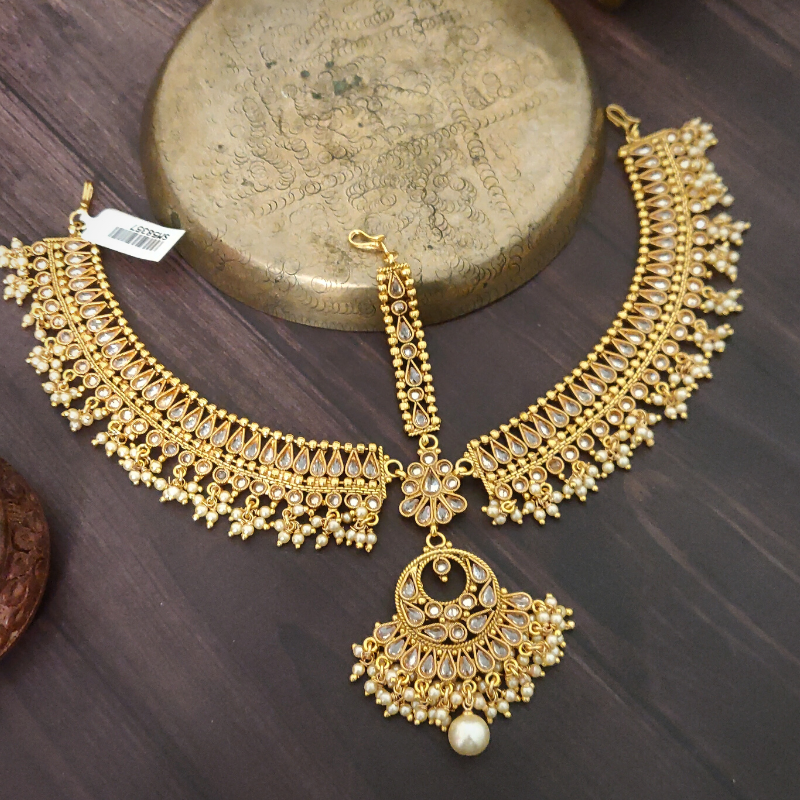 The mathapatti is adorned with reverse zircon stones and white pearl, which are gold plated to give it a beautiful, vintage appearance.