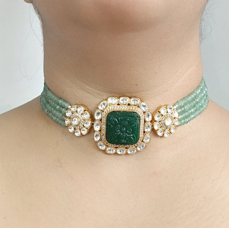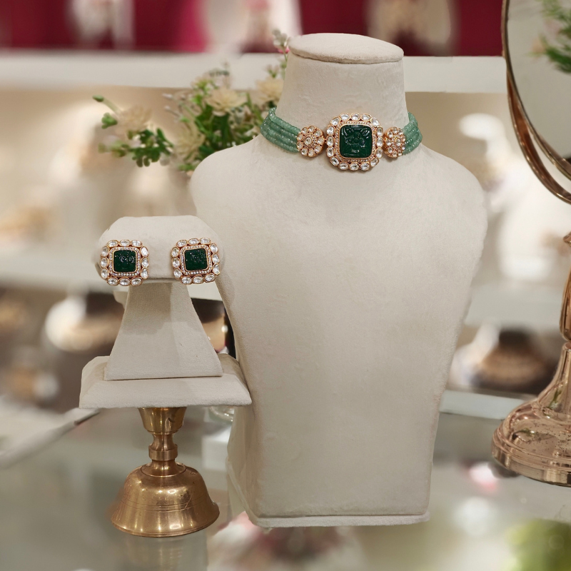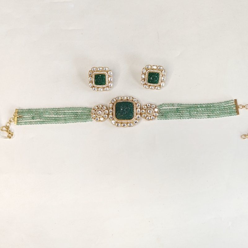 This striking choker set boasts a central Green pendant along with Polki stones on sides ,complemented by elegant studs adorned with Mint green coloured stones beaded at the back.