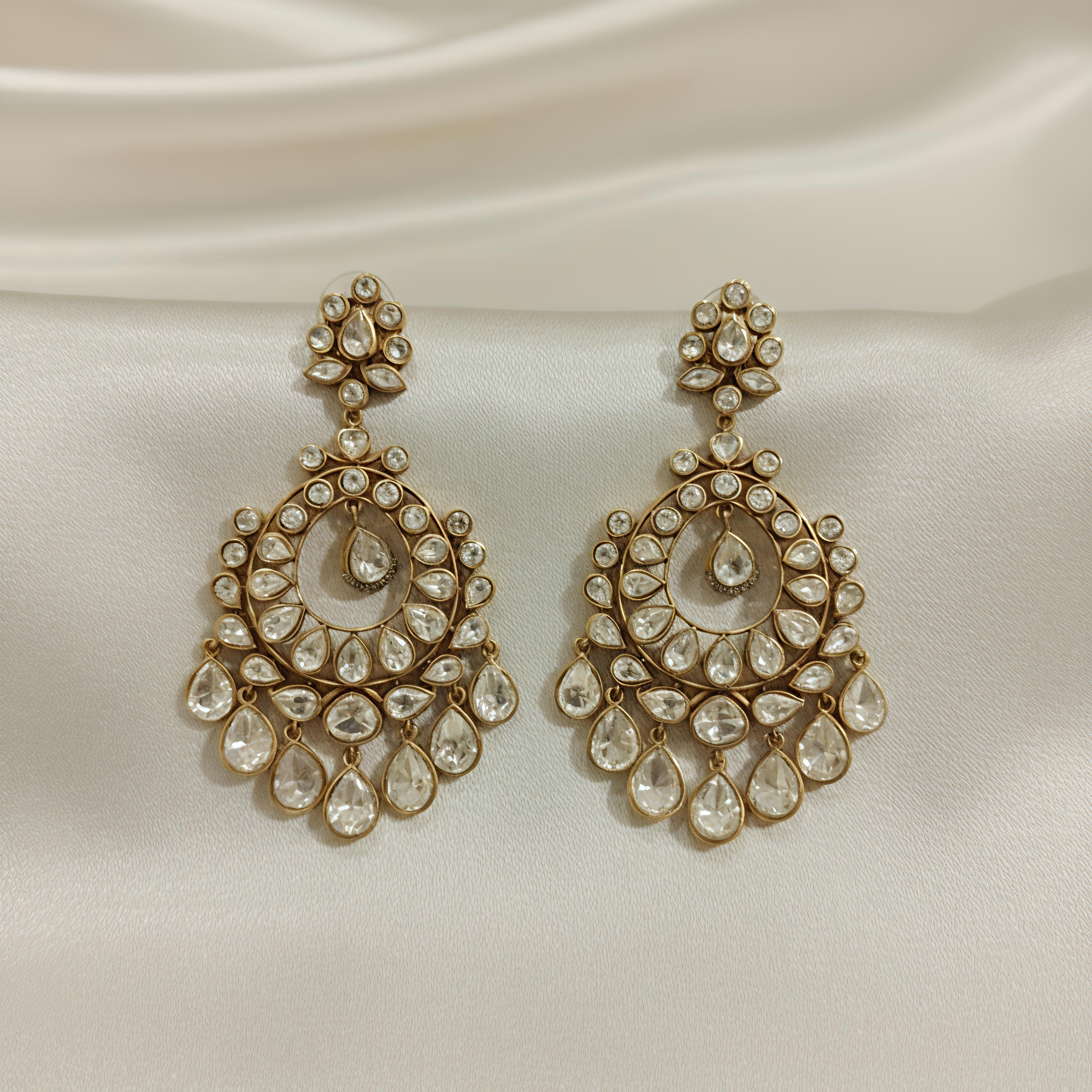 Beautiful moissanite chaandbali earrings crafted with 22 kt mixed metal alloy with bombay clasp at the back .