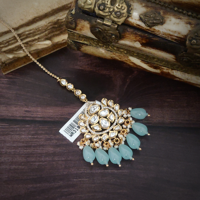 This magnificent maangtikka is crafted using uncut artificial polki stones and aqua coloured drops . It boasts an 18kt gold plated finish, adding to its exquisite beauty.