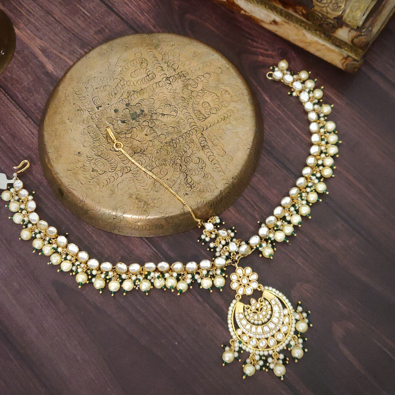 A mathpatti in paachi kundan with green beads and pearls is adorned with a maangtikka that has a Chaandbali shape.