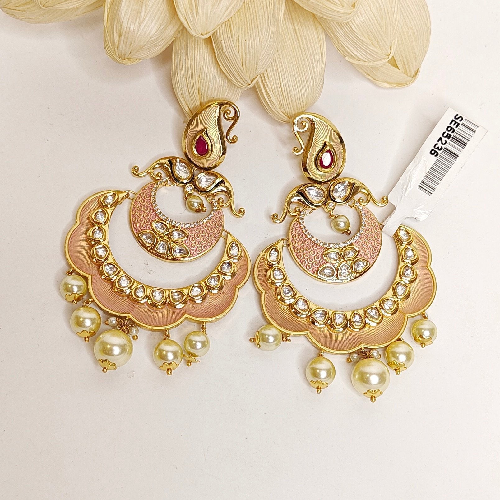 18 kt Gold plated Bela chaandbali enameled in Peach and pink colour and studded with Artificial Polki and beaded with off white shell Pearls .