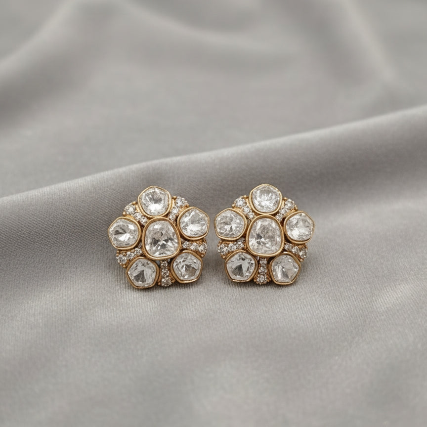 Beautiful mid sized moissanite studs with cz stones ,plated in 22 kt matt gold colour and have a bombay clasp at the back