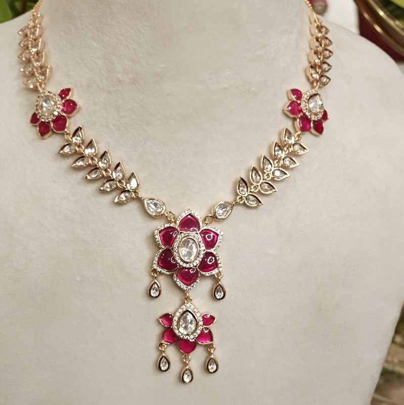 Bevlin chain set is beautifully designed in flower and petal pattern and studded with hot pink polki stones, surrounded with micro cz and plated in rose gold colour .