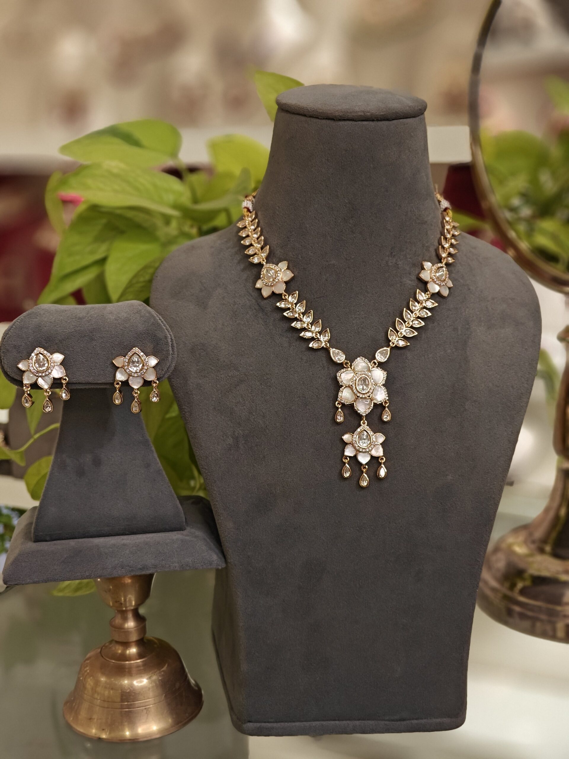Bevlin chain set is beautifully designed in flower and petal pattern and studded with mop stones surrounded with micro cz and plated in rose gold colour .