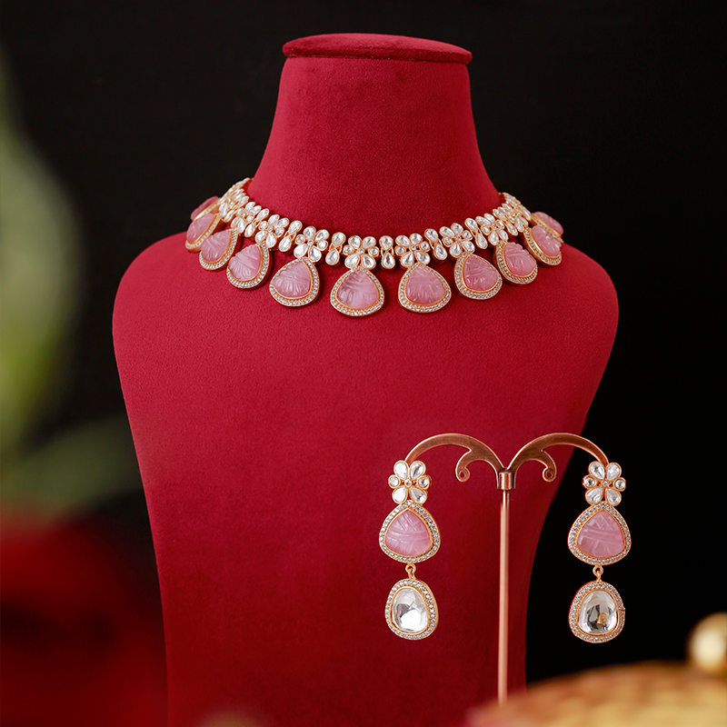This luxurious necklace set features intricately designed Pink stones that have been expertly hand-carved, and is plated with 22 karat gold. The stunning stones are adorned with dazzling polki and cz stones, making this set a truly opulent accessory.