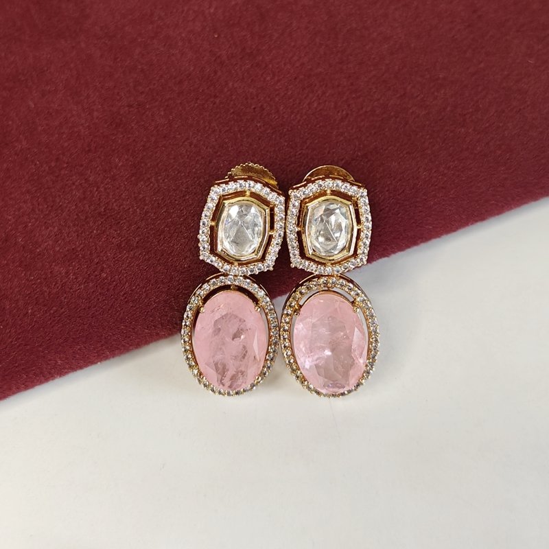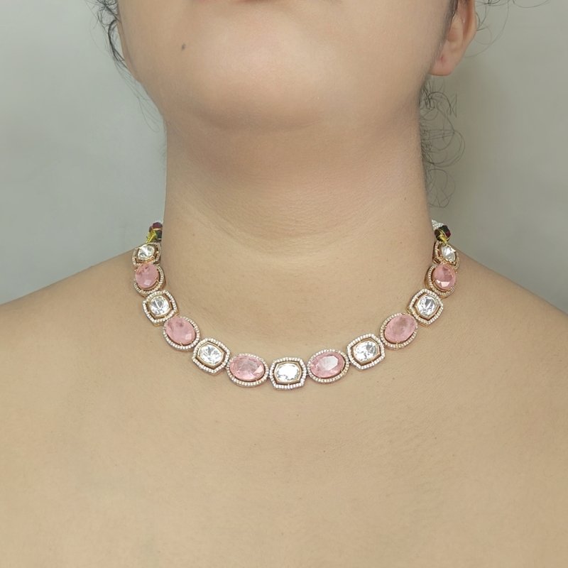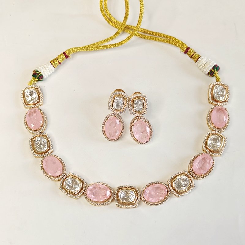 This elegant single neckline set features uncut Polki stones with baby pink doublet stones , plated in a rich 18kt gold color. A truly sophisticated and timeless piece, perfect for adding a touch of luxury to any ensemble.