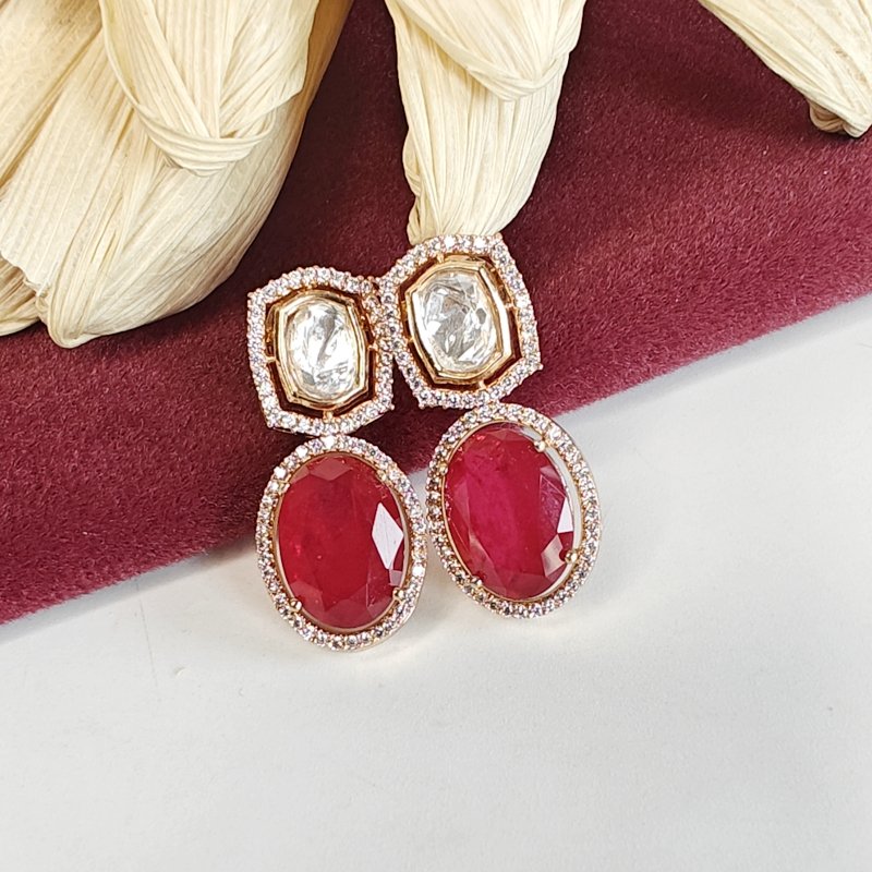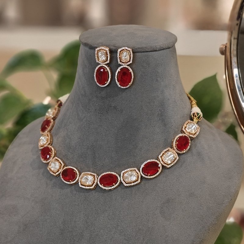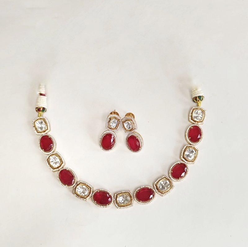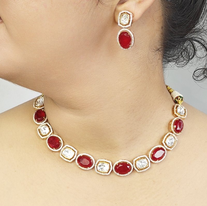 This elegant single neckline set features uncut Polki stones with ruby red stones , plated in a rich 18kt gold color. A truly sophisticated and timeless piece, perfect for adding a touch of luxury to any ensemble.