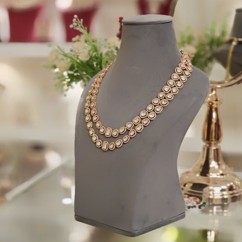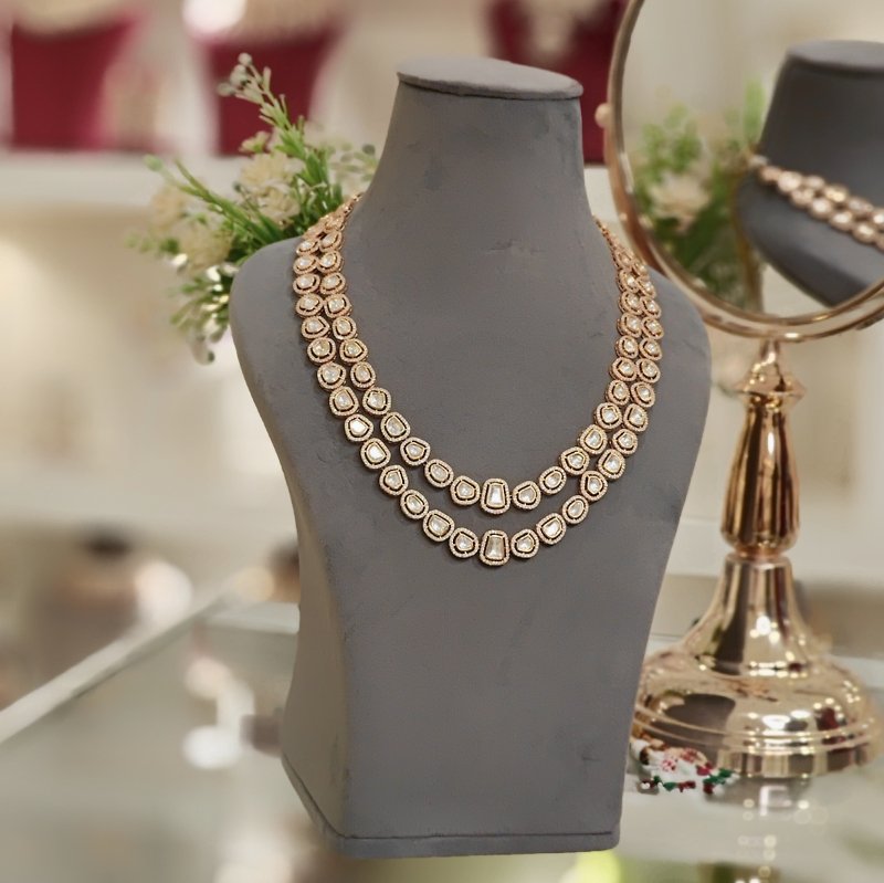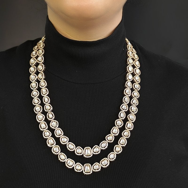 This exquisite necklace and earring set is crafted with artificial polkies and cubic zirconia, finished with an 18KT gold plating. Featuring a double-line design, it adds a bold yet elegant statement to your look. Perfect for special occasions or to add glamour to your everyday style.