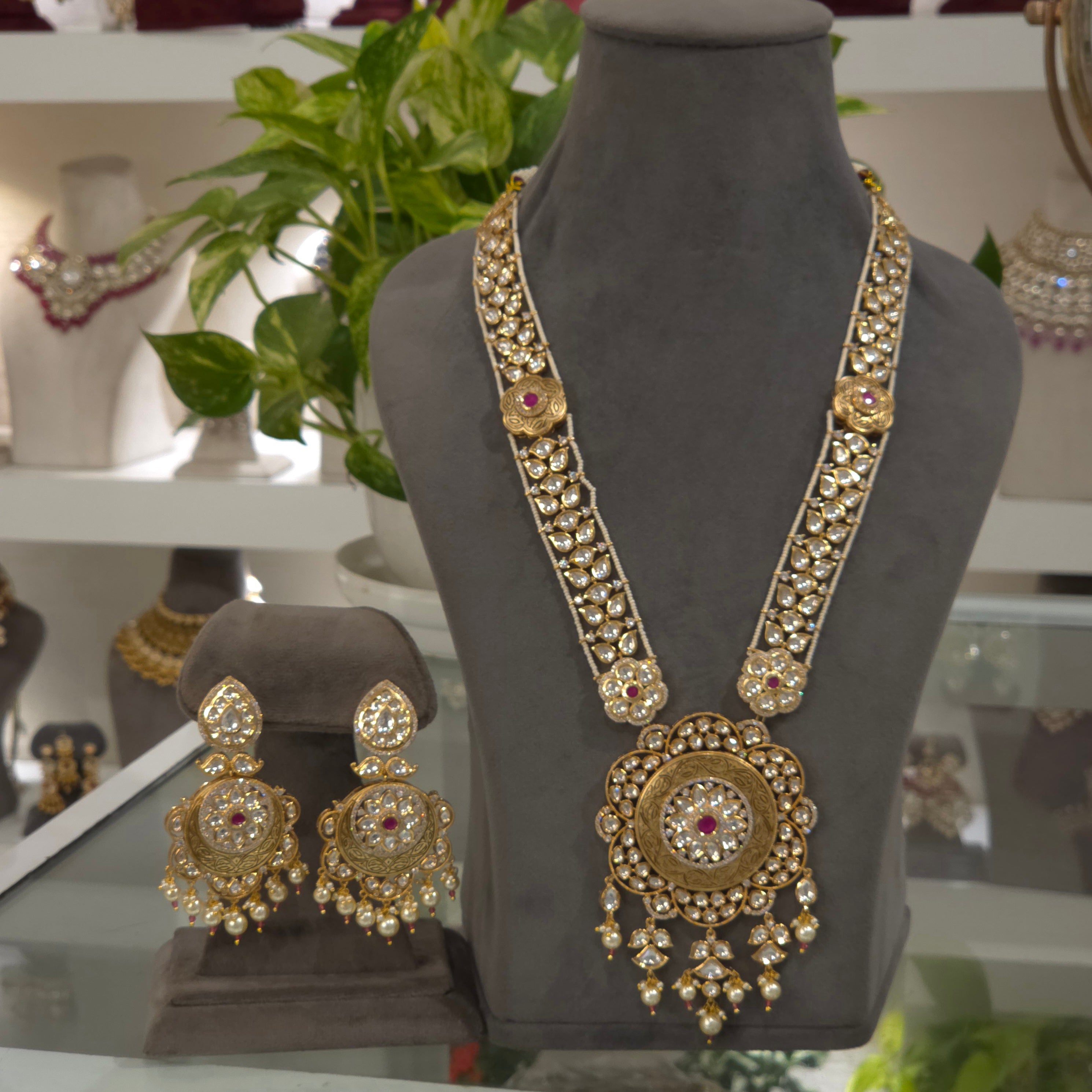 The Carnia antique polki set features high-quality gold-plated mixed metal alloy, accented with red ruby beads and white stones. This jewelry combines durability with an elegant aesthetic, offering a sophisticated addition to formal attire. The use of polki stones enhances its authenticity and traditional appeal.