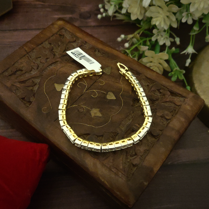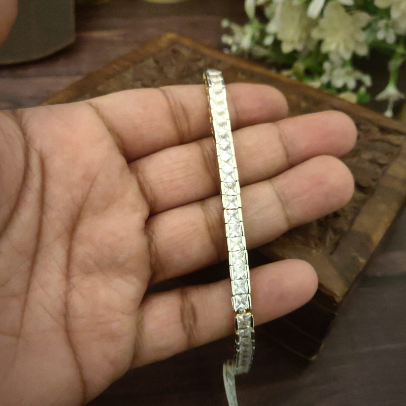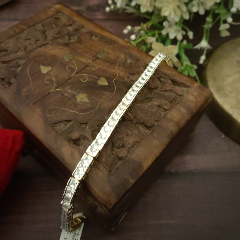 A sleek bracelet with a diamond-inspired design, adorned with emerald cut CZ stones and plated in white rhodium polish