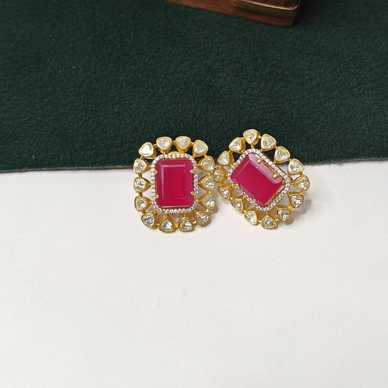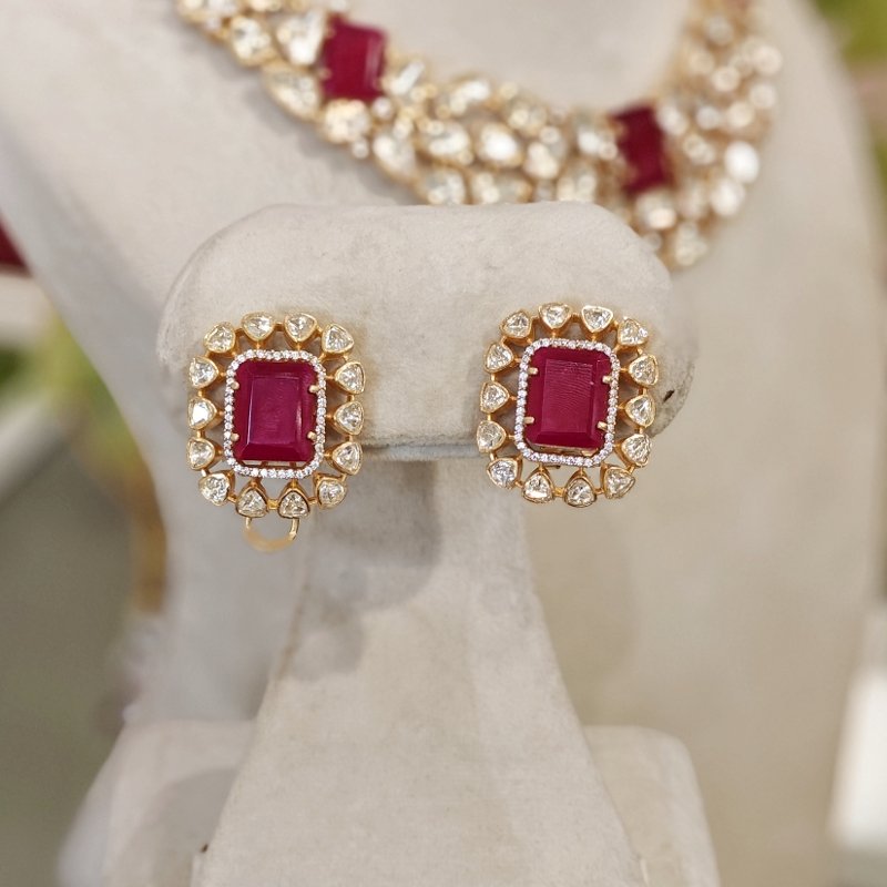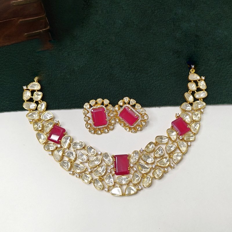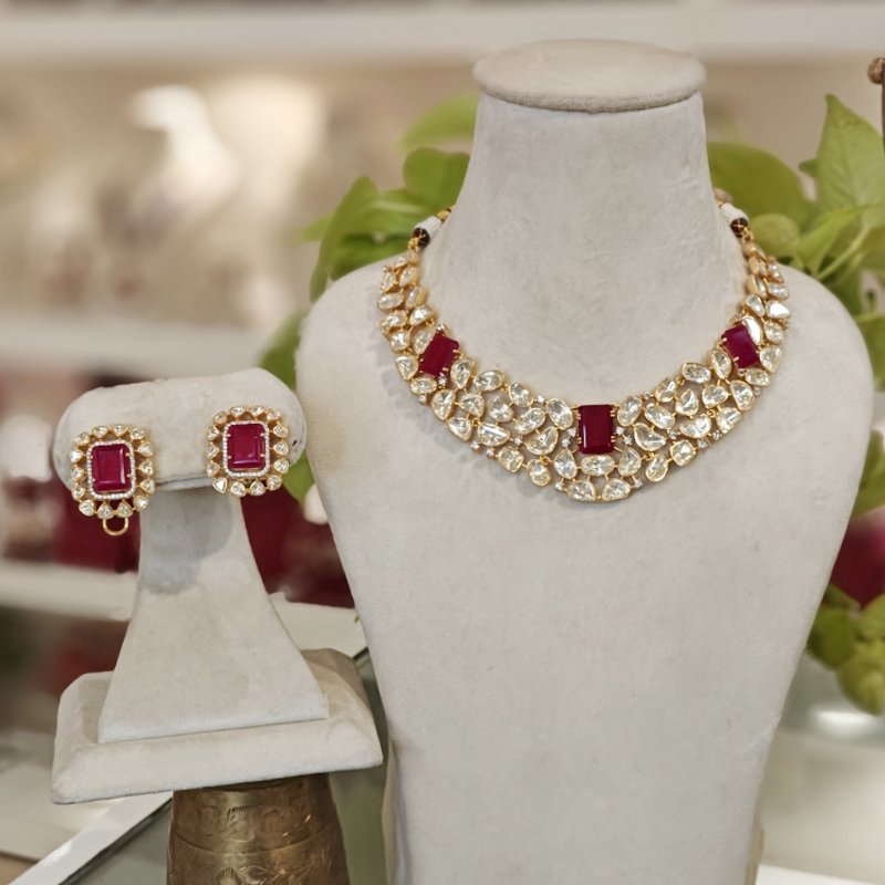 This stunning V Shaped neckline set is true masterpiece, featuring Moissanite polki and creative ruby gemstones. The design is complemented by intricate silver daak elements and plated with luxurious 22K gold, offering a captivating and elegant finish. Perfect for those seeking a blend of sophistication and timeless beauty.