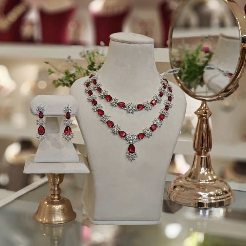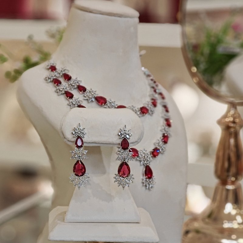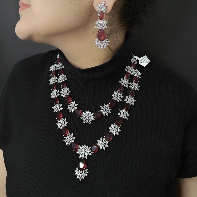 A stunning set featuring an Indo-Western double line design neckline and long dangling earrings crafted with CZ and Purple hydro faceted stones, all coated in sleek white rhodium plating.