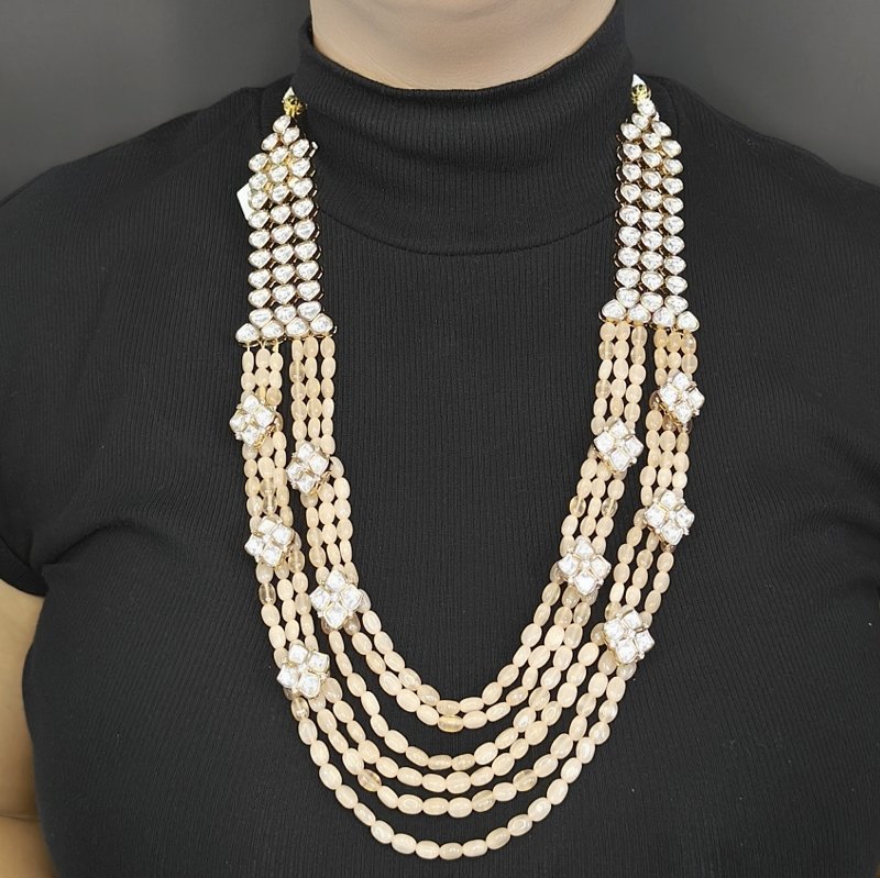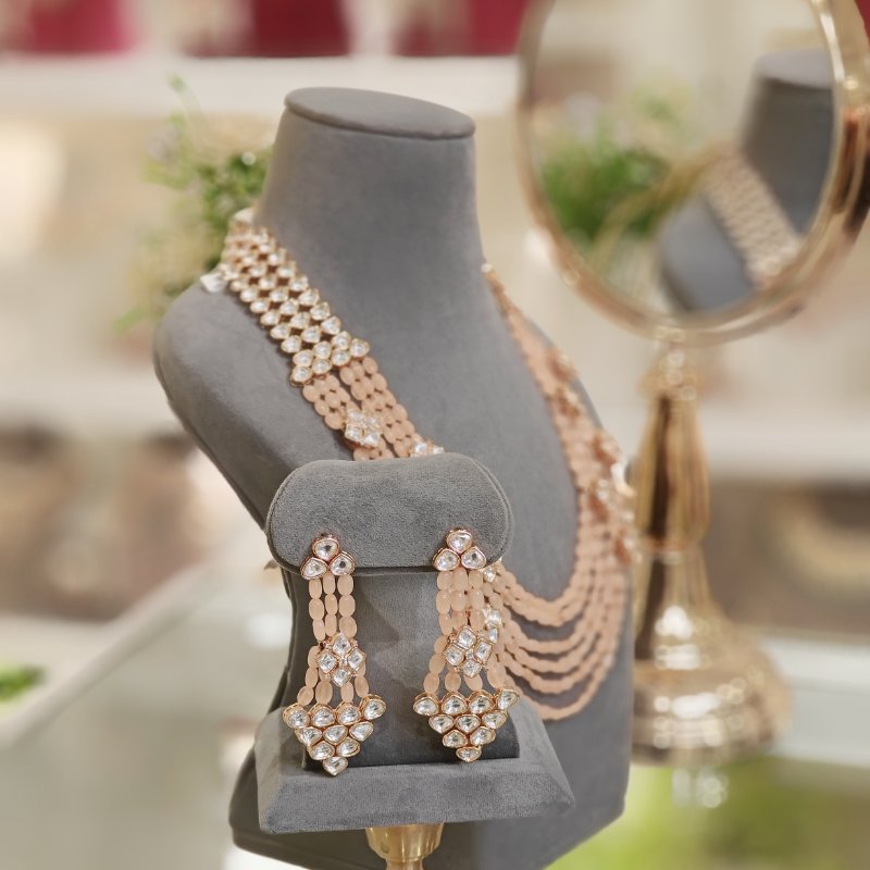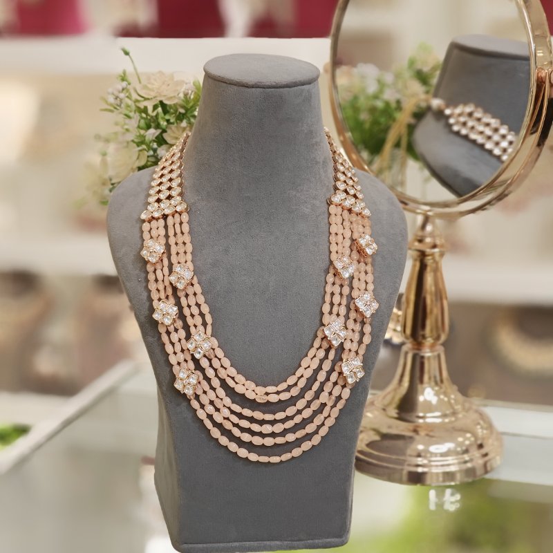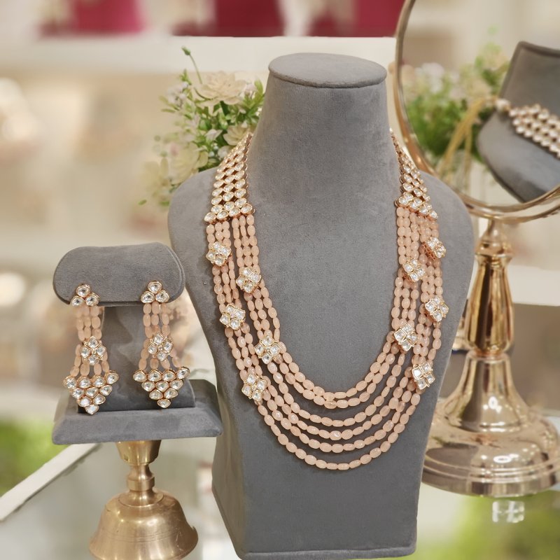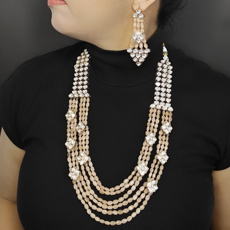 This eye-catching polki designer set is adorned with six rows of beautiful peach Monalisa beads, meticulously handcrafted to a medium length. The entire set is exquisitely plated in an opulent 18 kt gold color, adding a touch of elegance and luxury.