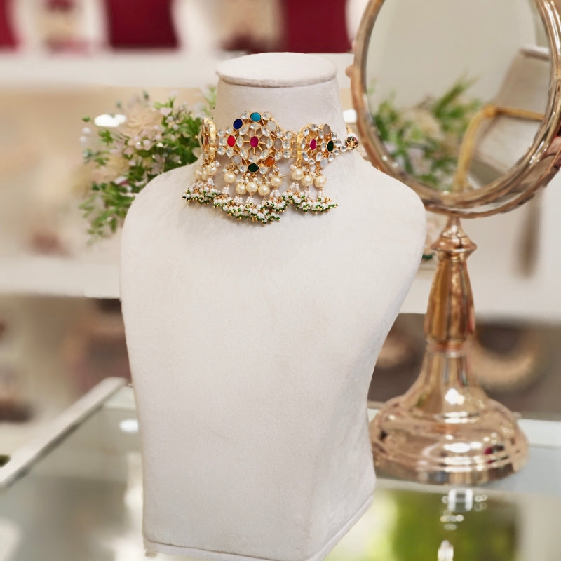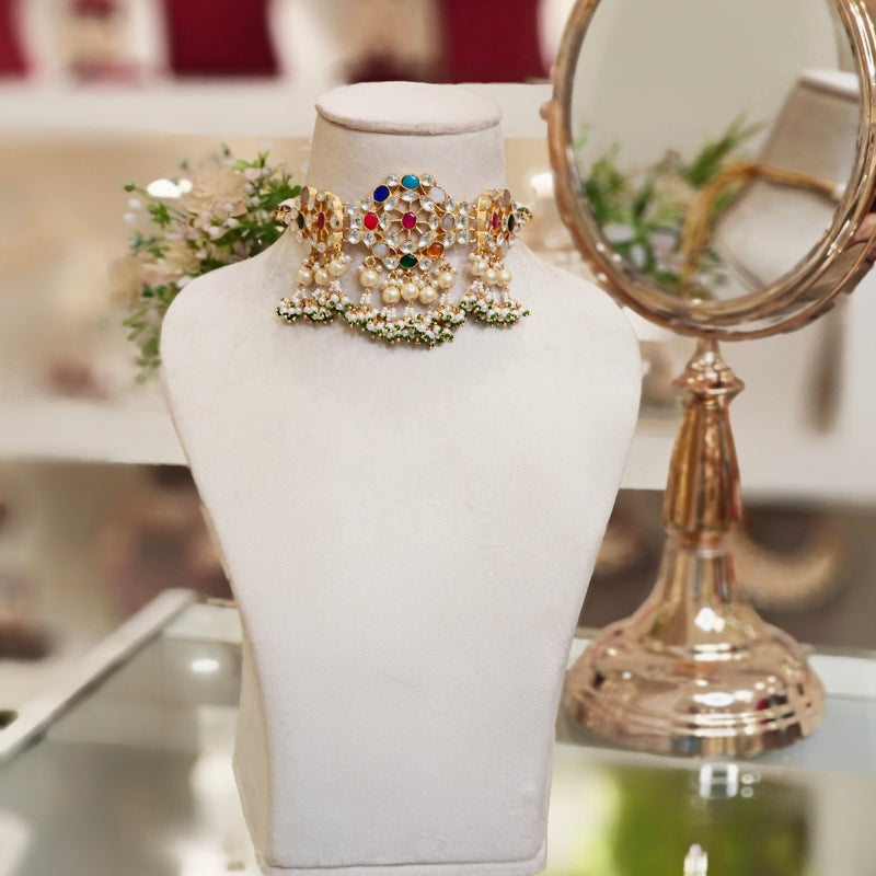 The Chandini Paachi Kundan Set,plated in 22 kt gold is embellished with the finest paachi kundan and beautifully adorned with big Studs. this choker is made in navrattan stones and beautifully beaded with pearls .