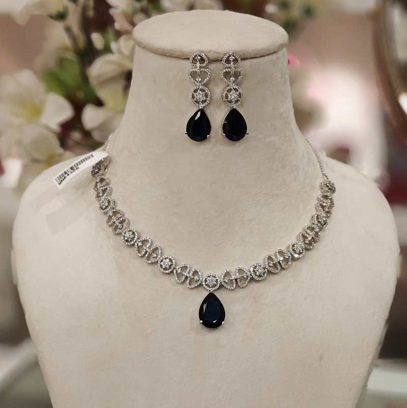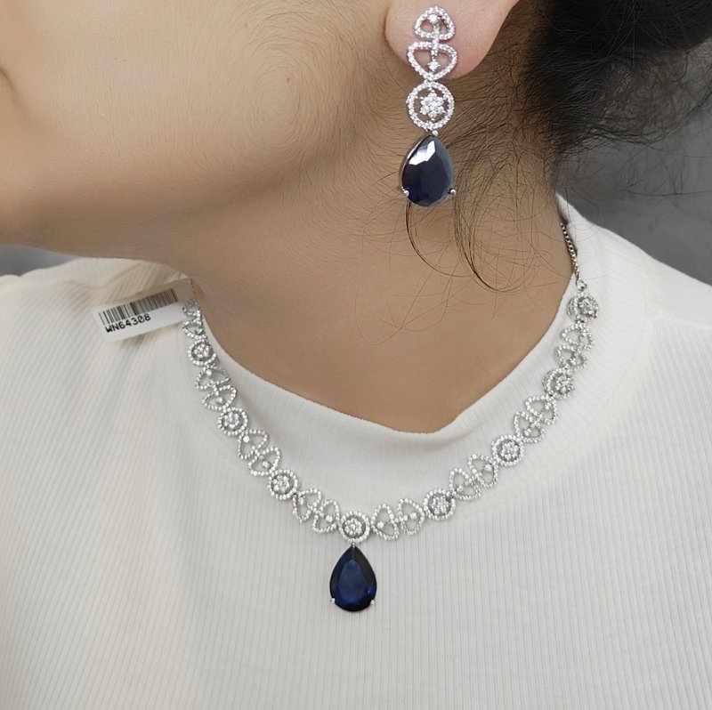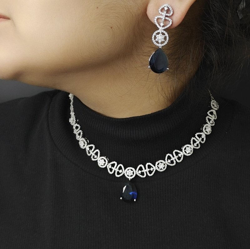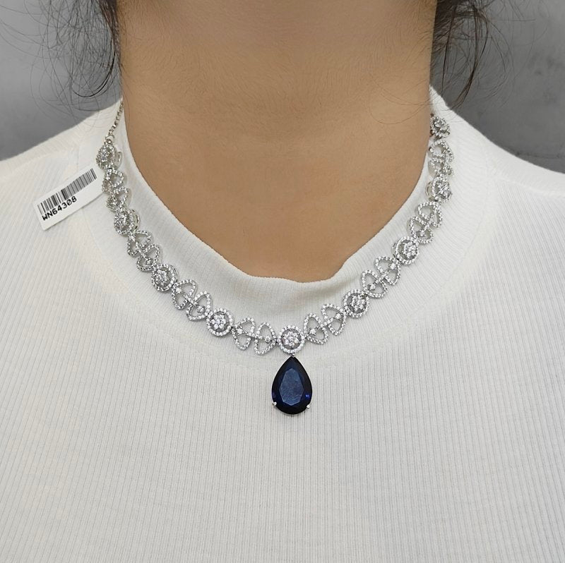 The exquisite neckpiece is created with tear shaped Blue and clear CZ stones . It has been elegantly designed with a White rhodium plating.