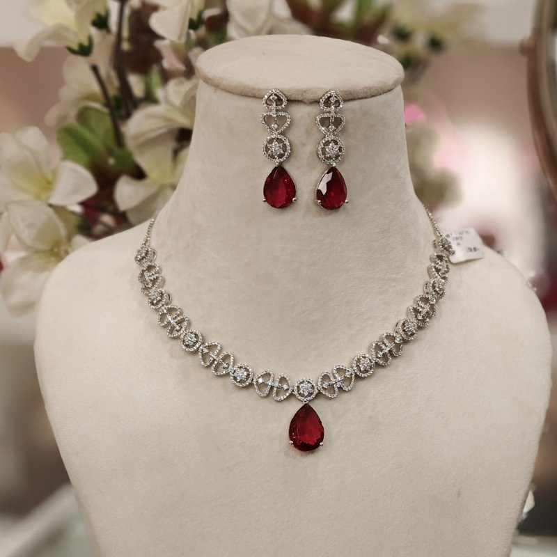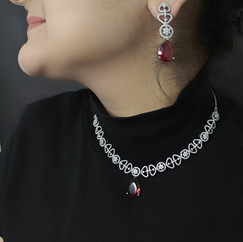 The exquisite neckpiece is created with tear shaped ruby creative and clear CZ stones . It has been elegantly designed with a White rhodium plating.