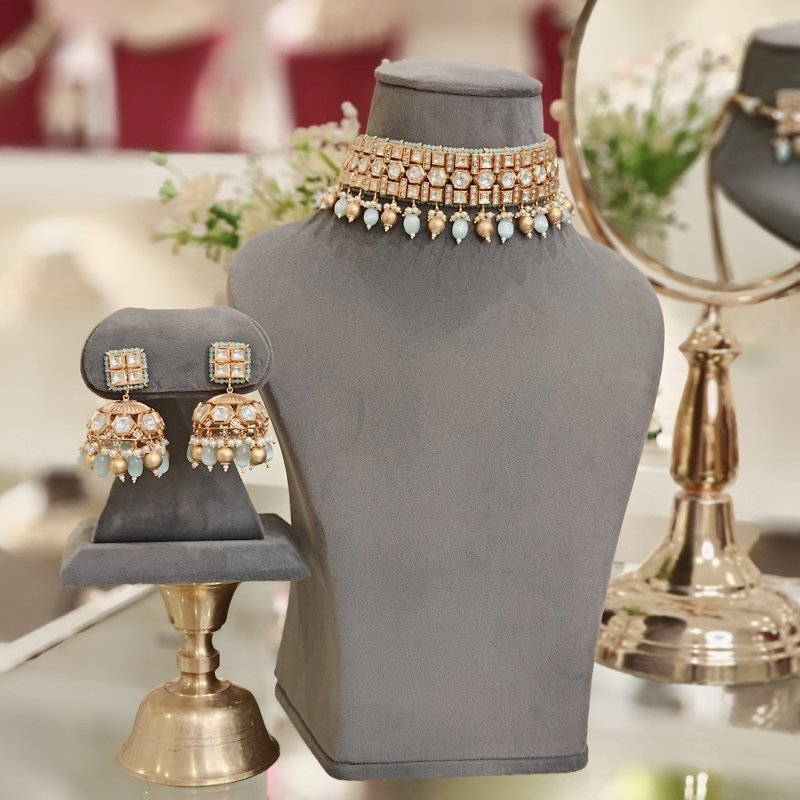 Crafted with uncut faux polkies, adorned with gold plated balls and sea green beads, this choker necklace exudes a luxurious aura with its 18 karat gold plating. Complete with jhumkas, it is a bold and striking statement piece.