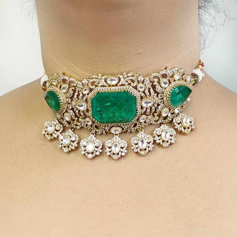 This lightweight gold-plated choker set is studded with emerald green doublet stone along with shimmering uncut cz polki, surrounded by sparkling CZ stones. Its delicate design makes it a beautiful and versatile piece, perfect for adding elegance to any occasion while offering both comfort and style.