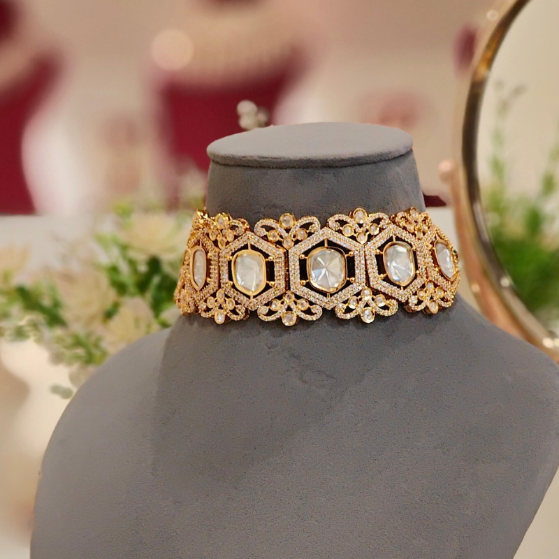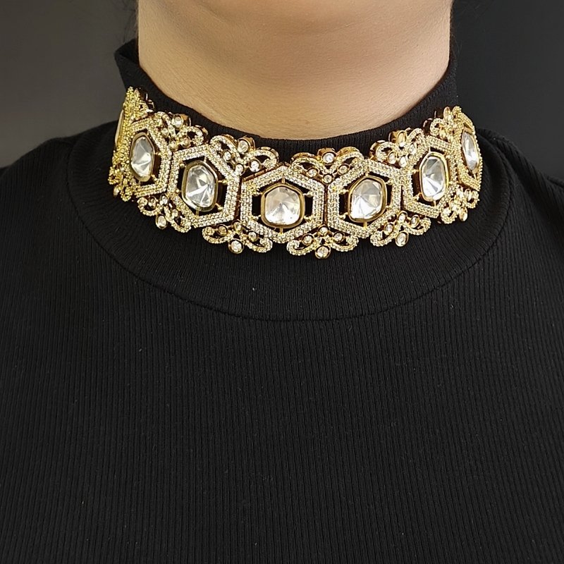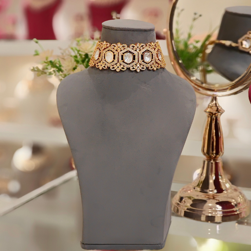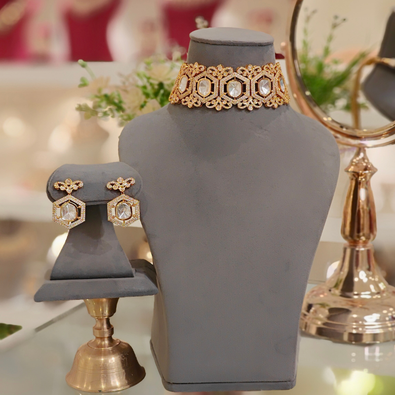 A necklace and earrings set with a hexagonal design, coated in 22 kt gold and adorned with individual polki and cz stones in a micro setting.