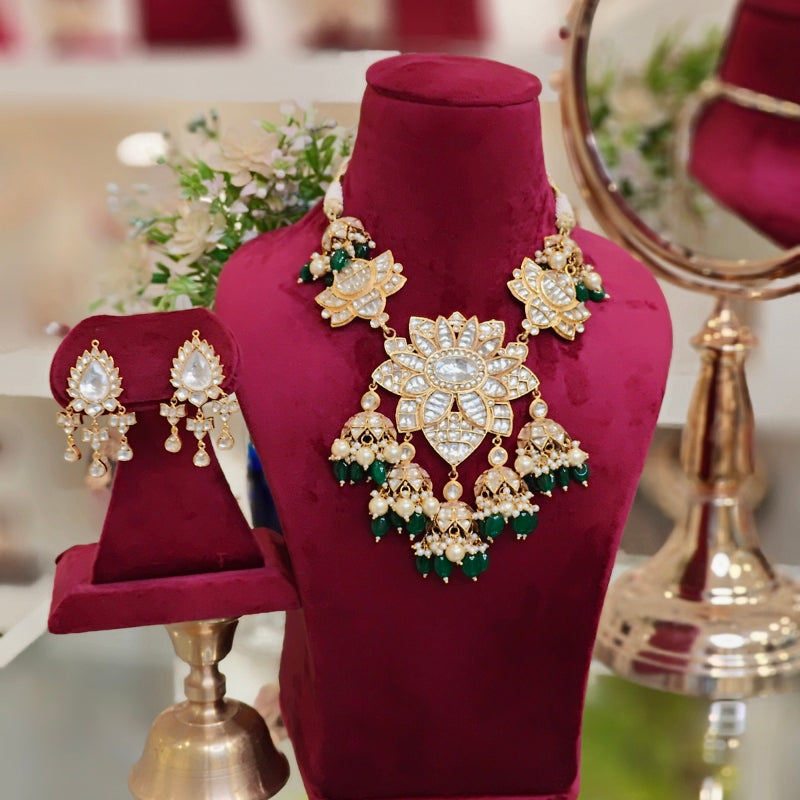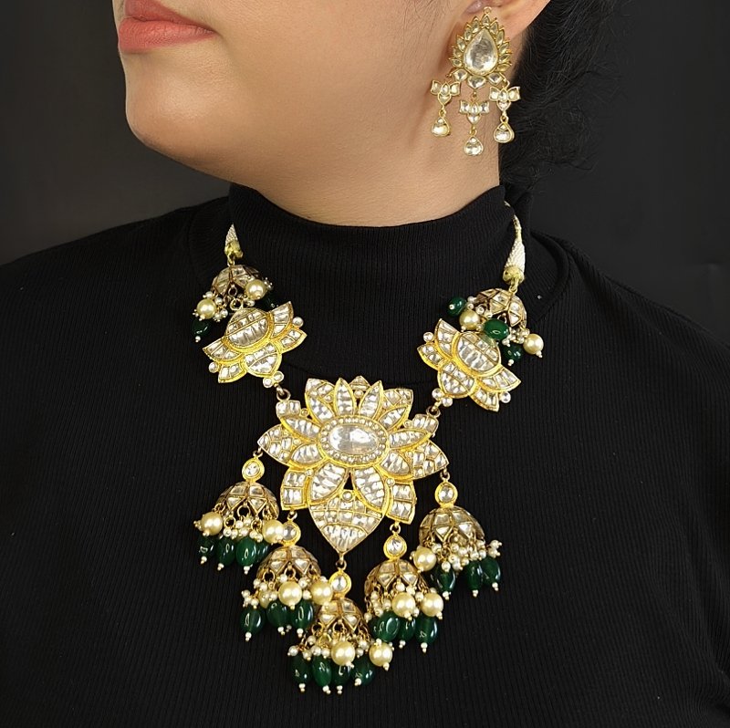 The Chetna mid lenght set,plated in 22 kt gold is embellished with the finest paachi kundan and beautifully adorned with kundan studs ,beaded with emerald green oval beads and pearls .