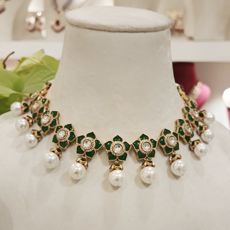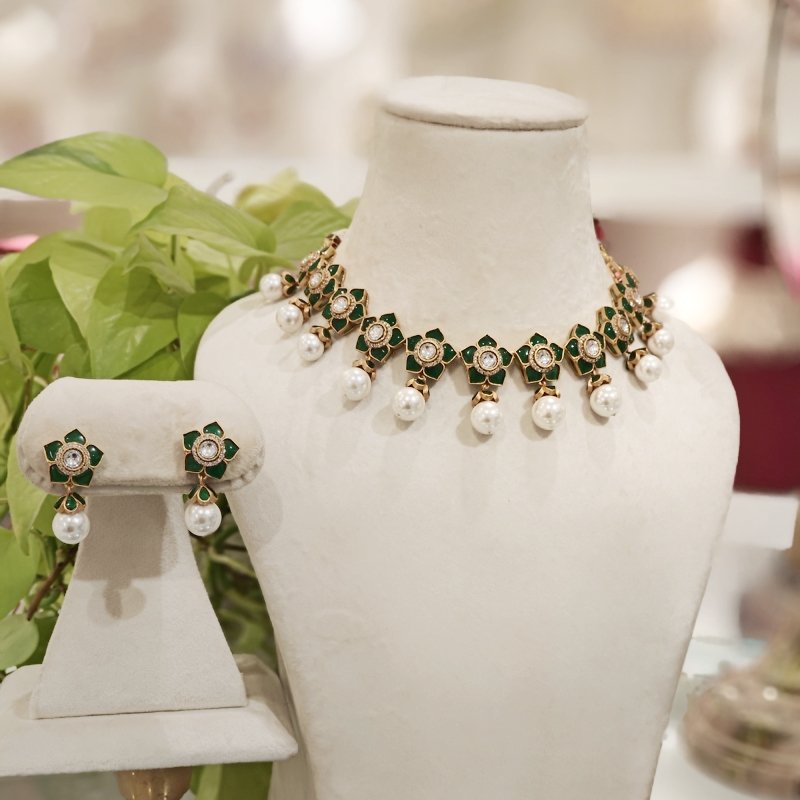 Chitra kundan set is made in emerald green kundan stones and plated in 22 kt gold beaded with shell pearls .