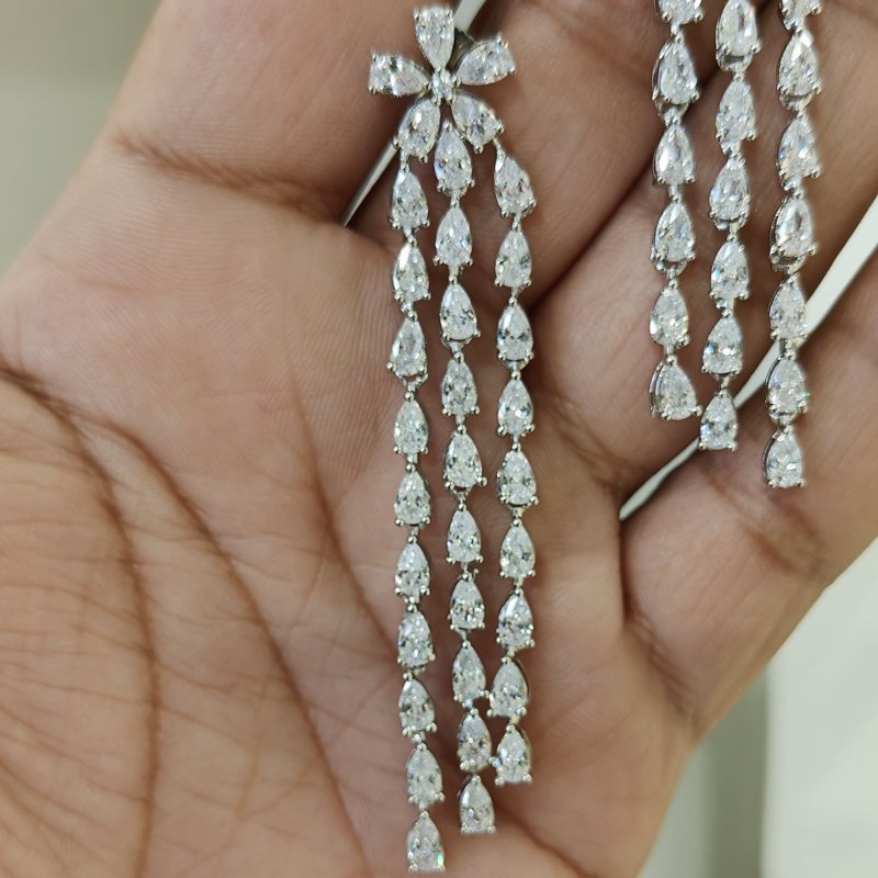 These stunning long earrings are made in three line pattern with tear drop shaped clear zirconia .