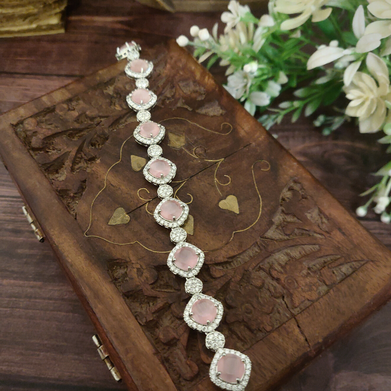 A square-shaped cz bracelet features a round hydro stone in Pink green color, encircled by cz stones and coated with white rhodium.