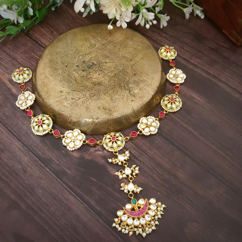 An exquisite mathapatti with a 22 kt gold plating is created in Ahemdabadi style, accentuated with delicate coloured paachi kundan work. Adorned with pearls , this stunning piece is sure to make a statement.