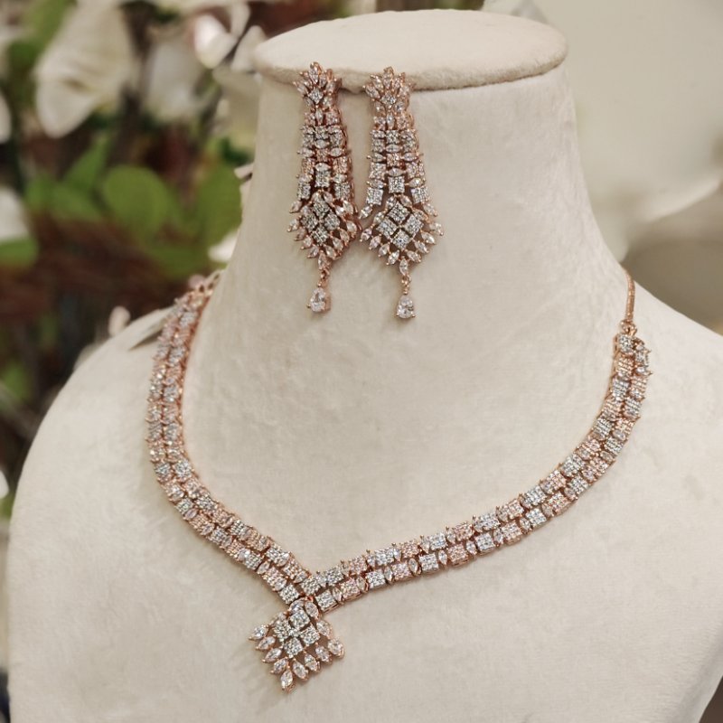 Lovely rose gold plated v-shaped necklace set with marquise and round brilliant cut cz stones .