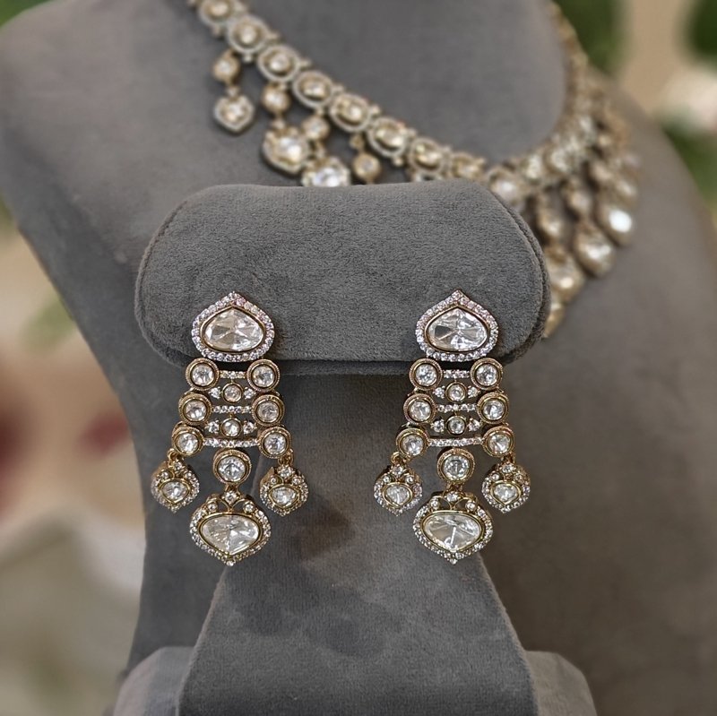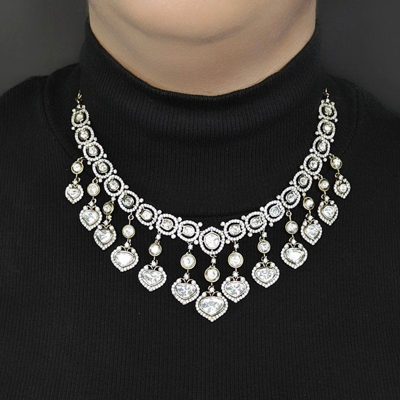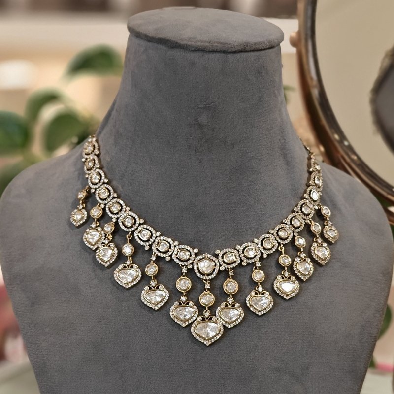 This elegant single neckline set features uncut Polki stones , plated in a victorian silver and 14 ktgold polish . A truly sophisticated and timeless piece, perfect for adding a touch of luxury to any ensemble.
