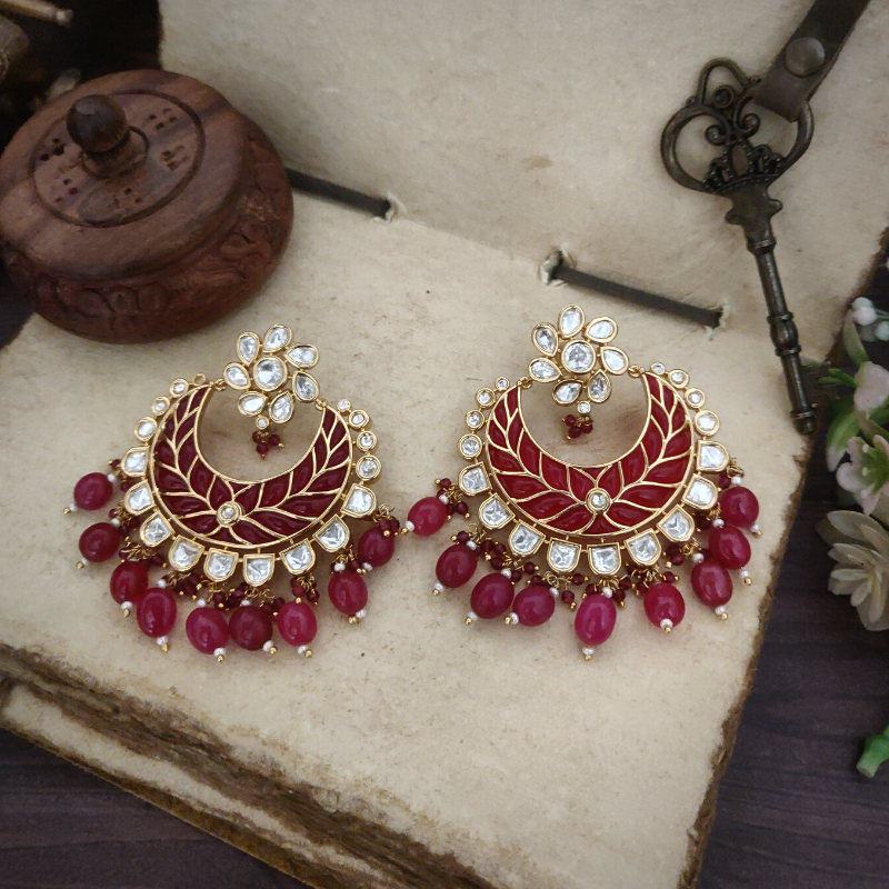 Damini Polki Chandbali Earrings are made with Artificial uncut cut Polki and enameled in red meena with ruby red beadings.