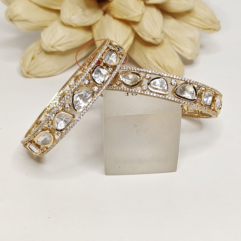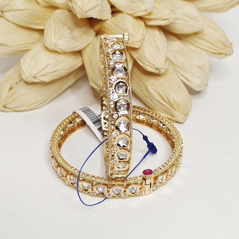 These bangles showcase a two-line design with CZ and uncut silver foil polki stones, elegantly plated in 18k gold.