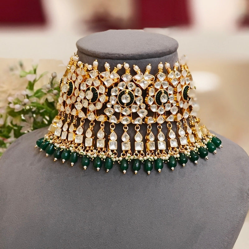 The Deepika choker set ,plated in 22 kt gold is embellished with the finest paachi kundan and beautifully adorned with big jhumkas. The intricate design of the piece is further accentuated with the gorgeous combination of green beads and white pearls.