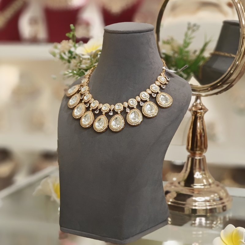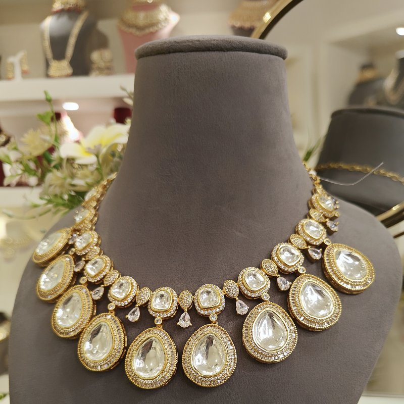 The Deepti Polki necklace features CZ polki stones, complemented by zirconia baguettes and coated in 22 karat gold. .
