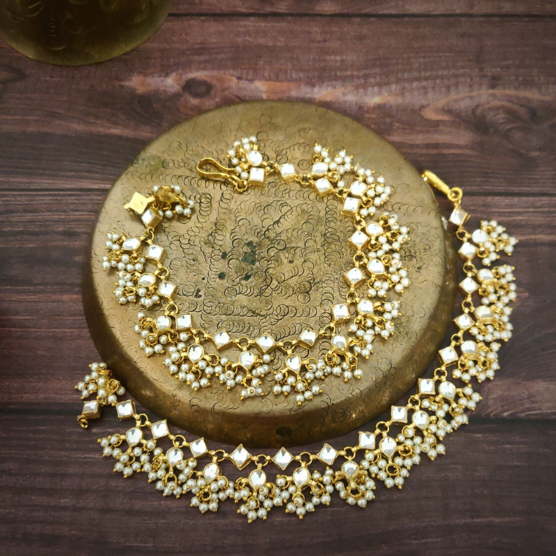 Kundan square saru pieces, adorned with delicate micro pearls, have been fashioned by Kanchain using 22 kt gold plating.